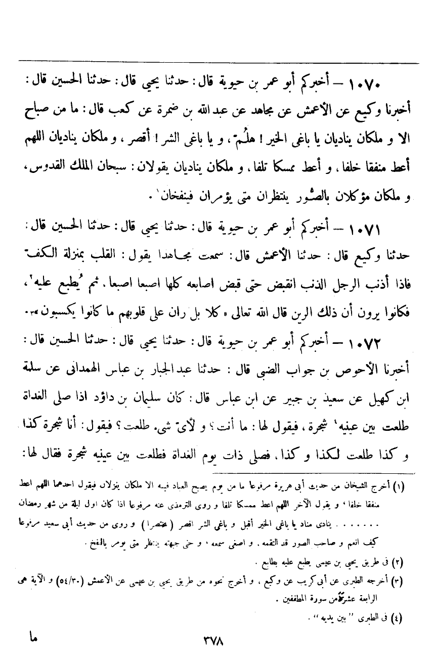 ١٠٧٠ - أَخْبَرَكُمْ أَبُو عُمَرَ بْنُ حَيَوَيْهِ قَالَ: حَدَّثَنَا يَحْيَى قَالَ: حَدَّثَنَا الْحُسَيْنُ، قَالَ: أَخْبَرَنَا وَكِيعٌ، عَنِ الْأَعْمَشِ، عَنْ مُجَاهِدٍ، عَنْ عَبْدِ اللَّهِ بْنِ ضَمْرَةَ، عَنْ كَعْبٍ قَالَ: " مَا مِنْ صَبَاحٍ إِلَّا وَمَلَكَانِ يُنَادِيَانِ: يَا بَاغِيَ الْخَيْرِ، هَلُمَّ، وَيَا بَاغِيَ الشَّرِّ، أَقْصِرْ، وَمَلَكَانِ يُنَادِيَانِ: اللَّهُمَّ أَعْطِ مُنْفِقًا خَلَفًا، وَأَعْطِ مُمْسِكًا تَلَفًا، وَمَلَكَانِ يُنَادِيَانِ يَقُولَانِ: سُبْحَانَ الْمَلِكِ الْقُدُّوسِ، وَمَلَكَانِ مُوَكَّلَانِ بِالصُّورِ، يَنْتَظِرَانِ مَتَى يُؤْمَرَانِ فَيَنْفُخَانِ "