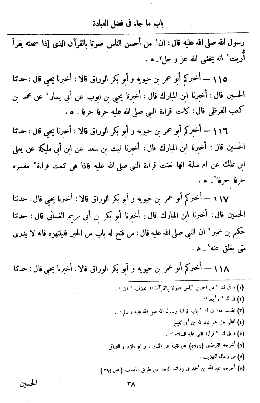 ١١٥ - أَخْبَرَكُمْ أَبُو عُمَرَ بْنُ حَيَوَيْهِ، وَأَبُو بَكْرٍ الْوَرَّاقُ قَالَا: أَخْبَرَنَا يَحْيَى قَالَ: حَدَّثَنَا الْحُسَيْنُ قَالَ: أَخْبَرَنَا ابْنُ الْمُبَارَكِ قَالَ: أَخْبَرَنَا يَحْيَى بْنُ أَيُّوبَ، عَنْ أَبِي يَسَارٍ، عَنْ مُحَمَّدِ بْنِ كَعْبٍ الْقُرَظِيِّ، قَالَ: «كَانَتْ قِرَاءَةُ النَّبِيِّ صَلَّى اللهُ عَلَيْهِ وَسَلَّمَ حَرْفًا حَرْفًا»