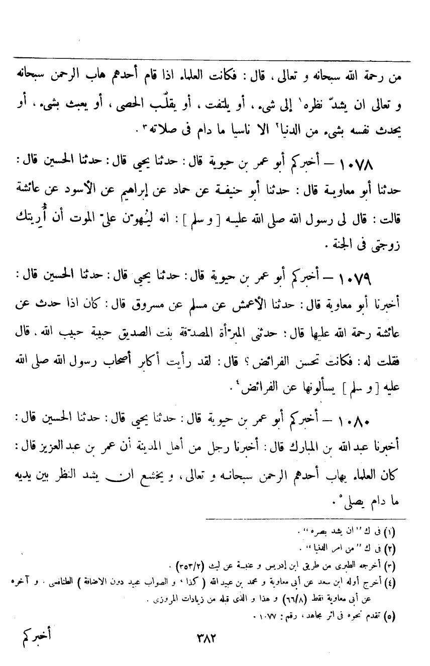 ١٠٧٩ - أَخْبَرَكُمْ أَبُو عُمَرَ بْنُ حَيَوَيْهِ قَالَ: حَدَّثَنَا يَحْيَى قَالَ: حَدَّثَنَا الْحُسَيْنُ، قَالَ: أَخْبَرَنَا أَبُو مُعَاوِيَةَ قَالَ: حَدَّثَنَا الْأَعْمَشُ، عَنْ مُسْلِمٍ، عَنْ مَسْرُوقٍ قَالَ: كَانَ إِذَا حَدَّثَ عَنْ عَائِشَةَ رَحْمَةُ اللَّهِ عَلَيْهَا، قَالَ: «حَدَّثَتْنِي الْمُبَرَّأَةُ الْمُصدَّقَةُ بِنْتُ الصِّدِّيقِ، حَبِيبَةُ حَبِيبِ اللَّهِ» ، قَالَ: فَقُلْتُ لَهُ: فَكَانَتْ تُحْسِنُ الْفَرَائِضَ؟ قَالَ: «لَقَدْ رَأَيْتُ أَكَابِرَ أَصْحَابِ رَسُولِ اللَّهِ صَلَّى اللهُ عَلَيْهِ وَسَلَّمَ يَسْأَلُونَهَا عَنِ الْفَرَائِضِ»