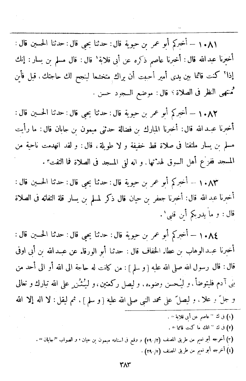 ١٠٨١ - أَخْبَرَكُمْ أَبُو عُمَرَ بْنُ حَيَوَيْهِ قَالَ: حَدَّثَنَا يَحْيَى قَالَ: حَدَّثَنَا الْحُسَيْنُ قَالَ: أَخْبَرَنَا عَبْدُ اللَّهِ قَالَ: أَخْبَرَنَا عَاصِمٌ، ذَكَرَهُ، عَنْ أَبِي قِلَابَةَ قَالَ: قَالَ مُسْلِمُ بْنُ يَسَارٍ: «إِنَّكَ إِذَا كُنْتَ قَائِمًا بَيْنَ يَدَيْ أَمِيرٍ أَحْبَبْتَ أَنْ يَرَاكَ مُتَخَشِّعًا لِيُنْجِحَ لَكَ حَاجَتَكَ» قِيلَ: فَأَيْنَ مُنْتَهَى النَّظَرِ فِي الصَّلَاةِ؟ قَالَ: «مَوْضِعُ السُّجُودِ حَسَنٌ»
