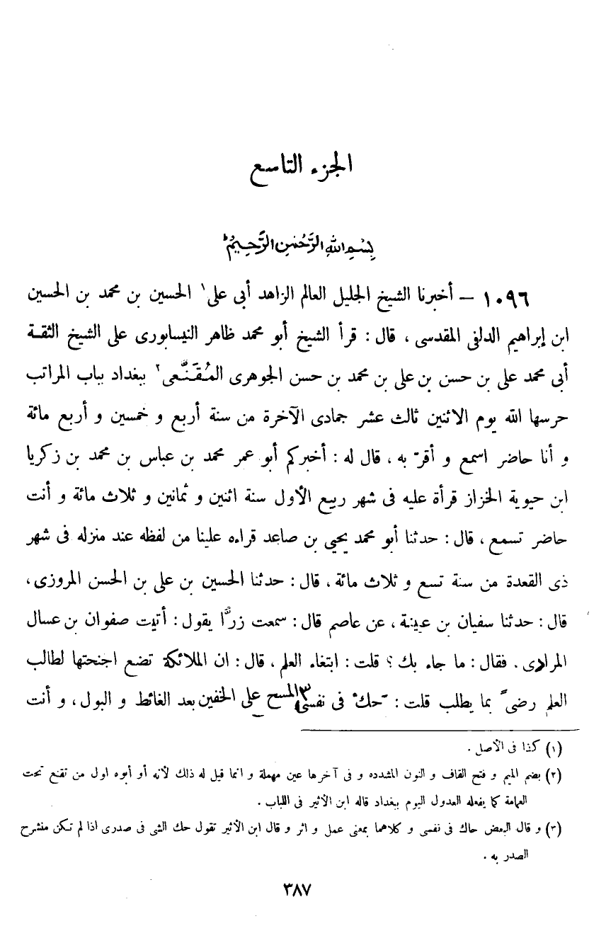 ١٠٩٦ - أَخْبَرَنَا الشَّيْخُ الْجَلِيلُ الْعَالِمُ الزَّاهِدُ أَبُو عَلِيٍّ الْحُسَيْنُ بْنُ مُحَمَّدِ بْنِ الْحُسَيْنِ بْنِ إِبْرَاهِيمَ الدُّلَفِيُّ الْمَقْدِسِيُّ قَالَ: قَرَأَ الشَّيْخُ أَبُو مُحَمَّدٍ ظَاهِرٌ النَّيْسَابُورِيُّ، عَلَى الشَّيْخِ الثِّقَةِ أَبِي مُحَمَّدٍ الْحَسَنِ بْنِ عَلِيِّ بْنِ مُحَمَّدِ بْنِ عَلِيِّ بْنِ الْحَسَنِ الْجَوْهَرِيِّ الْمُقَنَّعِيِّ بِبَغْدَادَ بِبَابِ الْمَرَاتِبِ حَرَسَهَا اللَّهُ يَوْمَ الْإِثْنَيْنِ ثَالِثَ عَشَرَ جُمَادَى الْآخِرَةِ مِنْ سَنَةِ أَرْبَعٍ وَخَمْسِينَ وَأَرْبَعِمِائَةٍ وَأَنَا حَاضِرٌ أَسْمَعُ، وَأَقَرَّ بِهِ، قَالَ لَهُ: أَخْبَرَكُمْ أَبُو عُمَرَ مُحَمَّدُ بْنُ الْعَبَّاسِ بْنِ مُحَمَّدِ بْنِ زَكَرِيَّا بْنِ حَيَوَيْهِ الْخَزَّازُ، قِرَاءَةً عَلَيْهِ فِي شَهْرِ رَبِيعٍ الْأَوَّلِ سَنَةَ اثْنَتَيْنِ وَثَمَانِينَ وَثَلَاثِمِائَةٍ وَأَنْتَ حَاضِرٌ تَسْمَعُ قَالَ: حَدَّثَنَا أَبُو مُحَمَّدٍ يَحْيَى بْنُ صَاعِدٍ قَرَأَهُ عَلَيْنَا مِنْ لَفْظِهِ عِنْدَ مَنْزِلِهِ فِي شَهْرِ ذِي الْقِعْدَةِ مِنْ سَنَةِ تِسْعٍ وَثَلَاثِمِائَةٍ قَالَ: حَدَّثَنَا الْحُسَيْنُ بْنُ الْحَسَنِ الْمَرْوَزِيُّ قَالَ: حَدَّثَنَا سُفْيَانُ بْنُ عُيَيْنَةَ، عَنْ عَاصِمٍ قَالَ: سَمِعْتُ زِرًّا يَقُولُ: أَتَيْتُ صَفْوَانَ بْنَ عَسَّالٍ الْمُرَادِيَّ، فَقَالَ: مَا جَاءَ بِكَ؟ قُلْتُ: ابْتِغَاءُ الْعِلْمِ، قَالَ: إِنَّ الْمَلَائِكَةَ تَضَعُ أَجْنِحَتَهَا لِطَالِبِ الْعِلْمِ رِضًى بِمَا يَطْلُبُ، قُلْتُ: حَكَّ فِي نَفْسِي الْمَسْحُ عَلَى الْخُفَّيْنِ بَعْدَ الْغَائِطِ وَالْبَوْلِ، وَأَنْتَ ⦗٣٨٨⦘ امْرُؤٌ مِنْ أَصْحَابِ رَسُولِ اللَّهِ صَلَّى اللهُ عَلَيْهِ وَسَلَّمَ، فَهَلْ سَمِعْتَهُ يَذْكُرُ فِي ذَلِكَ شَيْئًا؟ قَالَ: نَعَمْ، كَانَ يَأْمُرُنَا إِذَا كُنَّا سَفَرًا، أَوْ مُسَافِرِينَ أَلَّا نَنْزِعَ خِفَافَنَا ثَلَاثَةَ أَيَّامٍ إِلَّا مِنْ جَنَابَةٍ، وَلَكِنْ مِنْ غَائِطٍ أَوْ بَوْلٍ، قُلْتُ: فَهَلْ سَمِعْتَهُ يَذْكُرُ فِي الْهَوَى شَيْئًا؟ قَالَ: نَعَمْ، بَيْنَا نَحْنُ نَسِيرُ مَعَهُ إِذَا نَادَاهُ أَعْرَابِيٌّ بِصَوْتٍ لَهُ جَهُورِيٍّ، يَا مُحَمَّدُ، فَأَجَابَهُ بِنَحْوٍ مِنْ صَوْتِهِ: «هَاؤُمُ» ، فَقَالَ لَهُ: أَرَأَيْتَ رَجُلًا أَحَبَّ قَوْمًا وَلَمَّا يَلْحَقْ بِهِمْ؟ قَالَ: «الْمَرْءُ مَعَ مَنْ أَحَبَّ يَوْمَ الْقِيَامَةِ» ، فَلَمْ يَزَلْ يُحَدِّثُنَا حَتَّى قَالَ: " إِنَّ مِنْ قِبَلِ الْمَغْرِبِ بَابًا فَتَحَهُ اللَّهُ لِلتَّوْبَةِ يَوْمَ خَلَقَ السَّمَوَاتِ وَالْأَرْضِ، عَرْضُهُ مَسِيرَةُ أَرْبَعِينَ عَامًا - أَوْ قَالَ: سَبْعِينَ عَامًا - لَا يُغْلِقُهُ حَتَّى تَطْلُعَ الشَّمْسُ مِنْ مَغْرِبِهَا "