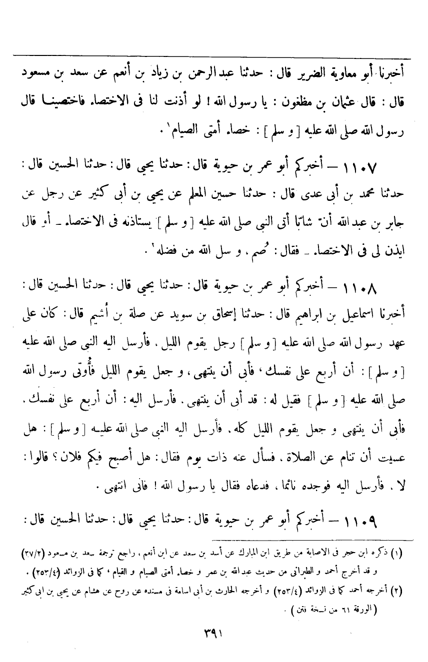 ١١٠٧ - أَخْبَرَكُمْ أَبُو عُمَرَ بْنُ حَيَوَيْهِ قَالَ: حَدَّثَنَا يَحْيَى قَالَ: حَدَّثَنَا الْحُسَيْنُ، قَالَ: حَدَّثَنَا مُحَمَّدُ بْنُ أَبِي عَدِيٍّ قَالَ: حَدَّثَنَا حُسَيْنٌ الْمُعَلِّمُ، عَنْ يَحْيَى بْنِ أَبِي كَثِيرٍ، عَنْ رَجُلٍ، عَنْ جَابِرِ بْنِ عَبْدِ اللَّهِ، أَنَّ شَابًا أَتَى النَّبِيَّ صَلَّى اللهُ عَلَيْهِ وَسَلَّمَ يَسْتَأْذِنُهُ فِي الِاخْتِصَاءِ - أَوْ قَالَ: ائْذَنْ لِي فِي الِاخْتِصَاءِ - فَقَالَ: «صُمْ، وَسَلِ اللَّهَ مِنْ فَضْلِهِ»