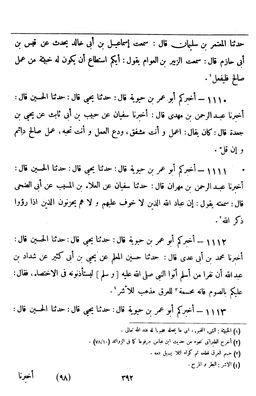 ١١١٠ - أَخْبَرَكُمْ أَبُو عُمَرَ بْنُ حَيَوَيْهِ قَالَ: حَدَّثَنَا يَحْيَى قَالَ: حَدَّثَنَا الْحُسَيْنُ، قَالَ: أَخْبَرَنَا عَبْدُ الرَّحْمَنِ بْنُ مَهْدِيٍّ قَالَ: أَخْبَرَنَا سُفْيَانُ، عَنْ حَبِيبِ بْنِ أَبِي ثَابِتٍ، عَنْ يَحْيَى بْنِ جَعْدَةَ قَالَ: " كَانَ يُقَالُ: اعْمَلْ وَأَنْتَ مُشْفِقٌ، وَدَعِ الْعَمَلَ وَأَنْتَ تُحِبُّهُ، عَمَلٌ صَالِحٌ دَائِمٌ وَإِنْ قَلَّ