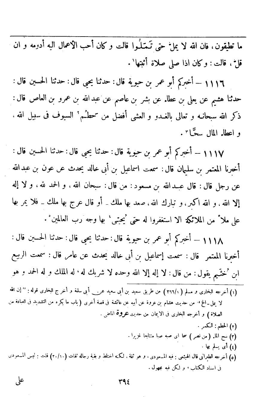 ١١١٨ - أَخْبَرَكُمْ أَبُو عُمَرَ بْنُ حَيَوَيْهِ قَالَ: حَدَّثَنَا يَحْيَى قَالَ: حَدَّثَنَا الْحُسَيْنُ، قَالَ: أَخْبَرَنَا الْمُعْتَمِرُ قَالَ: سَمِعْتُ إِسْمَاعِيلَ بْنَ أَبِي خَالِدٍ يُحَدِّثُ، عَنْ عَامِرٍ قَالَ: سَمِعْتُ الرَّبِيعَ بْنَ خُثَيْمٍ يَقُولُ: " مَنْ قَالَ: لَا إِلَهَ إِلَّا اللَّهُ وَحْدَهُ لَا شَرِيكَ لَهُ، لَهُ الْمُلْكُ، وَلَهُ الْحَمْدُ، وَهُوَ ⦗٣٩٥⦘ عَلَى كُلِّ شَيْءٍ قَدِيرٌ عَشْرَ مَرَّاتٍ، فَهُوَ عِدْلُ أَرْبَعِ رِقَابٍ " فَقُلْتُ: عَمَّنْ تَرْوِيهِ؟ فَقَالَ: عَنْ عَمْرِو بْنِ مَيْمُونٍ الْأَوْدِيِّ، فَلَقِيتُ عَمْرَو بْنَ مَيْمُونٍ، فَقُلْتُ: عَمَّنْ تَرْوِيهِ؟ فَقَالَ: عَنْ عَبْدِ الرَّحْمَنِ بْنِ أَبِي لَيْلَى، فَلَقِيتُ عَبْدَ الرَّحْمَنِ بْنَ أَبِي لَيْلَى، فَقُلْتُ: إِنَّ عَمْرَو بْنَ مَيْمُونٍ، يَرْوِي عَنْكَ أَنَّهُ مَنْ قَالَ: «لَا إِلَهَ إِلَّا اللَّهُ وَحْدَهُ لَا شَرِيكَ لَهُ، لَهُ الْمَلِكُ، وَلَهُ الْحَمْدُ، وَهُوَ عَلَى كُلِّ شَيْءٍ قَدِيرٌ عَشْرَ مَرَّاتٍ، فَهُوَ عِدْلُ أَرْبَعِ رِقَابٍ» فَقَالَ: نَعَمْ، أَنَا أَخْبَرْتُهُ إِيَّاهُ، فَقُلْتُ لِعَبْدِ الرَّحْمَنِ: عَمَّنْ تَرْوِيهِ؟ قَالَ: عَنْ أَبِي أَيُّوبَ الْأَنْصَارِيِّ صَاحِبِ رَسُولِ اللَّهِ صَلَّى اللهُ عَلَيْهِ وَسَلَّمَ