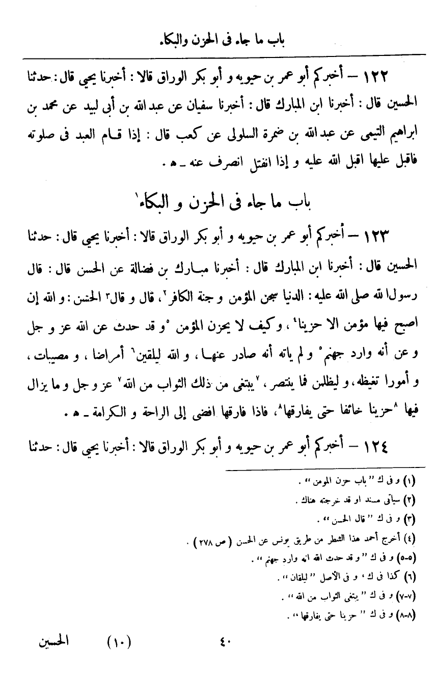 ١٢٤ - أَخْبَرَكُمْ أَبُو عُمَرَ بْنُ حَيَوَيْهِ، وَأَبُو بَكْرٍ الْوَرَّاقُ قَالَا: أَخْبَرَنَا يَحْيَى قَالَ: حَدَّثَنَا ⦗٤١⦘ الْحُسَيْنُ قَالَ: أَخْبَرَنَا ابْنُ الْمُبَارَكِ قَالَ: أَخْبَرَنَا سُفْيَانُ، عَنْ مَنْصُورٍ، عَنْ سَالِمِ بْنِ أَبِي الْجَعْدِ: قَالَ عِيسَى ابْنُ مَرْيَمَ صَلَّى اللهُ عَلَيْهِ وَسَلَّمَ: طُوبَى لِمَنْ خَزَنَ لِسَانَهُ، وَوَسِعَهُ بَيْتُهُ، وَبَكَى عَلَى خَطِيئَتِهِ