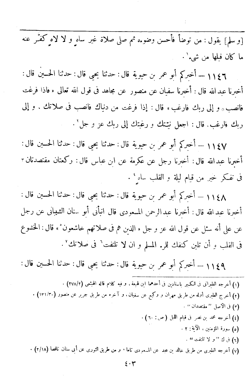 ١١٤٩ - أَخْبَرَكُمْ أَبُو عُمَرَ بْنُ حَيَوَيْهِ قَالَ: حَدَّثَنَا يَحْيَى قَالَ: حَدَّثَنَا الْحُسَيْنُ قَالَ ⦗٤٠٤⦘: أَخْبَرَنَا عَبْدُ اللَّهِ قَالَ: أَخْبَرَنَا سُفْيَانُ، عَنْ مَنْصُورٍ، عَنْ مُجَاهِدٍ، فِي قَوْلِ اللَّهِ تَعَالَى: {الَّذِينَ هُمْ فِي صَلَاتِهِمْ خَاشِعُونَ} [المؤمنون: ٢] قَالَ: «السُّكُونُ»