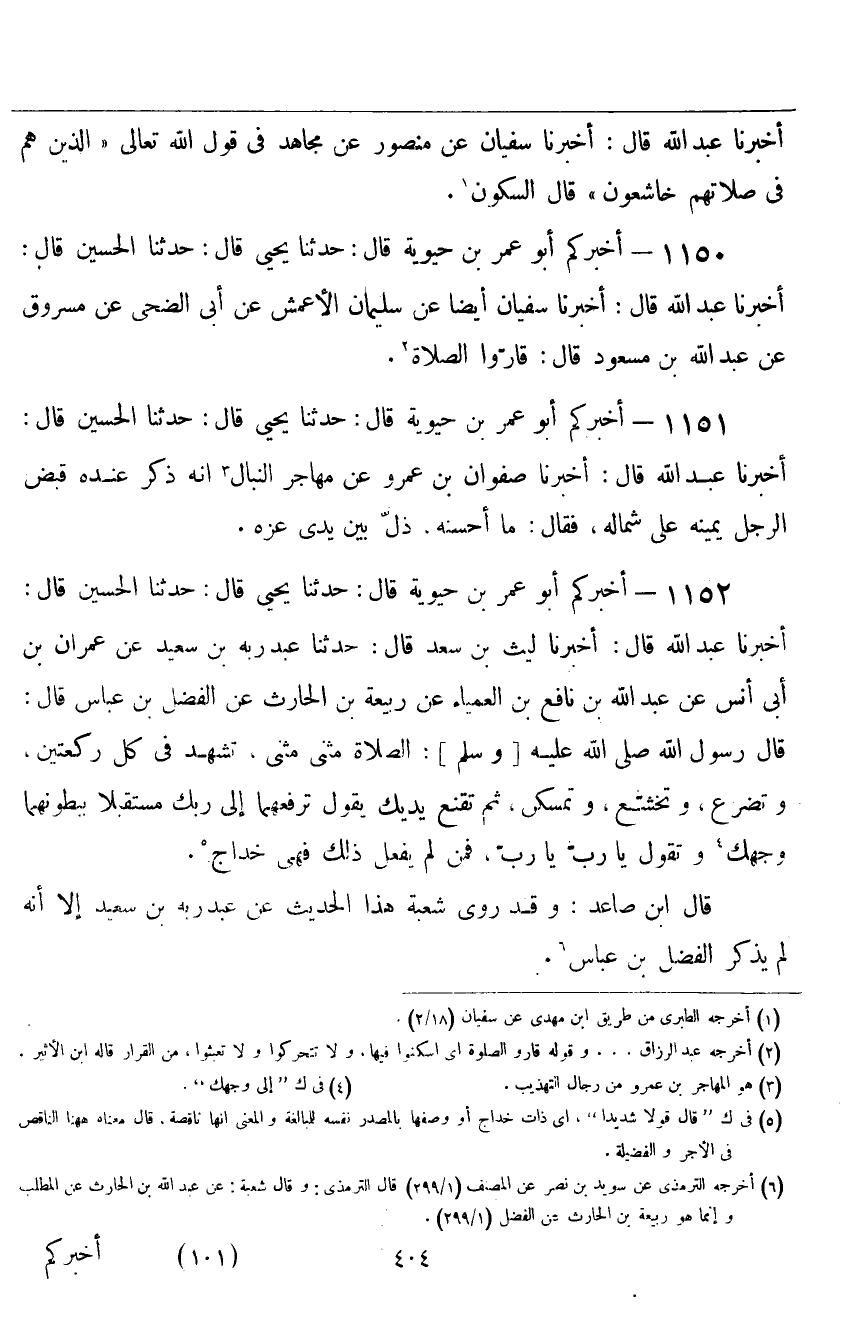 ١١٥٠ - أَخْبَرَكُمْ أَبُو عُمَرَ بْنُ حَيَوَيْهِ قَالَ: حَدَّثَنَا يَحْيَى قَالَ: حَدَّثَنَا الْحُسَيْنُ قَالَ: أَخْبَرَنَا عَبْدُ اللَّهِ قَالَ: أَخْبَرَنَا سُفْيَانُ أَيْضًا عَنْ سُلَيْمَانَ الْأَعْمَشِ، عَنْ أَبِي الضُّحَى، عَنْ مَسْرُوقٍ، عَنْ عَبْدِ اللَّهِ بْنِ مَسْعُودٍ قَالَ: «قَارُّوا الصَّلَاةَ»