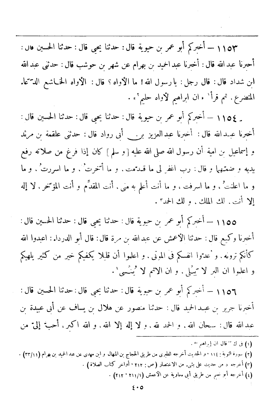١١٥٣ - أَخْبَرَكُمْ أَبُو عُمَرَ بْنُ حَيَوَيْهِ قَالَ: حَدَّثَنَا يَحْيَى قَالَ: حَدَّثَنَا الْحُسَيْنُ قَالَ: أَخْبَرَنَا عَبْدُ اللَّهِ قَالَ: أَخْبَرَنَا عَبْدُ الْحَمِيدِ بْنُ بَهْرَامَ، عَنْ شَهْرِ بْنِ حَوْشَبٍ قَالَ: حَدَّثَنِي عَبْدُ اللَّهِ بْنُ شَدَّادٍ، قَالَ: قَالَ رَجُلٌ: يَا رَسُولَ اللَّهِ، مَا الْأَوَّاهُ؟ قَالَ: " الْأَوَّاهُ: الْخَاشِعُ الدَّعَّاءُ الْمُتَضَرِّعُ "، ثُمَّ قَرَأَ: {إِنَّ إِبْرَاهِيمَ لَأَوَّاهٌ حَلِيمٌ} [التوبة: ١١٤]