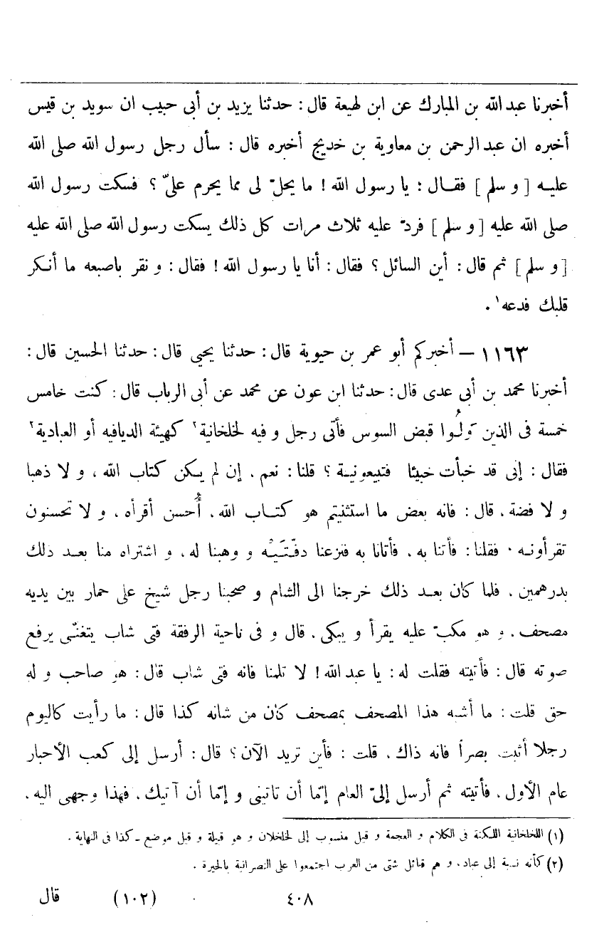 ١١٦٣ - أَخْبَرَكُمْ أَبُو عُمَرَ بْنُ حَيَوَيْهِ قَالَ: حَدَّثَنَا يَحْيَى قَالَ: حَدَّثَنَا الْحُسَيْنُ، قَالَ: أَخْبَرَنَا مُحَمَّدُ بْنُ أَبِي عَدِيٍّ قَالَ: حَدَّثَنَا ابْنُ عَوْنٍ، عَنْ مُحَمَّدٍ، عَنْ أَبِي الرَّبَابِ قَالَ: كُنْتُ خَامِسَ خَمْسَةٍ فِي الَّذِينَ وُلُّوا قَبْضَ السُّوسِ، فَأَتَى رَجُلٌ وَفِيهِ لَخْلَخَانِيَّةٌ كَهَيْئَةِ الدِّيَافِيَّةِ أَوِ الْعَبَّادِيَّةِ فَقَالَ: إِنِّي قَدْ خَبَّأْتُ خَبِيئًا فَتَبِيعُونِيهِ؟ قُلْنَا: نَعَمْ، إِنْ لَمْ يَكُنْ كِتَابَ اللَّهِ، وَلَا ذَهَبًا، وَلَا فِضَّةً، قَالَ: فَإِنَّهُ بَعْضُ مَا اسْتَثْنَيْتُمْ، هُوَ كِتَابُ اللَّهِ، أُحْسِنُ أَقْرَأُهُ، وَلَا تُحْسِنُونَ تَقْرَءُونَهُ، فَقُلْنَا: فَأْتِنَا بِهِ، فَأَتَانَا بِهِ، فَنَزَعْنَا دَفَّتَيْهِ، وَوَهَبْنَا لَهُ، وَاشْتَرَاهُ مِنَّا بَعْدَ ذَلِكَ بِدِرْهَمَيْنِ، فَلَمَّا كَانَ بَعْدَ ذَلِكَ خَرَجْنَا إِلَى الشَّامِ، وَصَحِبَنَا رَجُلٌ شَيْخٌ عَلَى حِمَارٍ بَيْنَ يَدَيْهِ مُصْحَفٌ، وَهُوَ مُكِبٌّ عَلَيْهِ يَقْرَأُ وَيَبْكِي، قَالَ: وَفِي نَاحِيَةِ الرُّفْقَةِ فَتًى شَابٌّ يَتَغَنَّى يَرْفَعُ صَوْتَهُ، قَالَ: فَأَتَيْتُهُ، فَقُلْتُ لَهُ: يَا عَبْدَ اللَّهِ، لَا تَلُمْنَا فَإِنَّهُ فَتًى شَابٌّ، قَالَ: هُوَ صَاحِبٌ، وَلَهُ حَقٌّ، قُلْتُ: مَا أَشْبَهَ هَذَا الْمُصْحَفُ بِمُصْحَفٍ كَانَ مِنْ شَأْنِهِ كَذَا، قَالَ: مَا رَأَيْتُ كَالْيَوْمِ رَجُلًا أَثْبَتَ بَصَرًا، فَإِنَّهُ ذَاكَ، قُلْتُ: فَأَيْنَ تُرِيدُ الْآنَ؟ قَالَ: أَرْسَلَ إِلَيَّ كَعْبُ الْأَحْبَارِ عَامَ الْأَوَّلِ، فَأَتَيْتُهُ، ثُمَّ أَرْسَلَ إِلَيَّ الْعَامَ، إِمَّا أَنْ تَأْتِيَنِي، وَإِمَّا أَنْ آتِيَكَ، فَهَذَا وَجْهِي إِلَيْهِ ⦗٤٠٩⦘، قَالَ: قُلْتُ: فَأَنَا مَعَكَ فَانْطَلَقْنَا حَتَّى قَدِمْنَا الشَّامَ، فَقَعَدَ عِنْدَ كَعْبٍ، فَجَاءَ عِشْرُونَ مِنَ الْيَهُودِ، فِيهِمْ شَيْخٌ كَبِيرٌ يَرْفَعُ حَاجِبَيْهِ بِحَرِيرَةٍ، فَقَالَ: أَوْسِعُوا أَوْسِعُوا، فَأَوْسَعُوا، وَرَكِبْنَا أَعْنَاقَهُمْ، فَتَكَلَّمُوا، فَقَالَ كَعْبٌ: يَا نُعَيْمُ، أَتُجِيبُ هَؤُلَاءِ أَوْ أُجِيبُهُمْ؟، فَقَالَ: دَعُونِي حَتَّى أُفَقِّهَ هَؤُلَاءِ مَا قَالُوا، ثُمَّ أُجِيبَهُمْ، إِنَّ هَؤُلَاءِ أَثْنَوْا عَلَى أَهْلِ مِلَّتِنَا خَيْرًا، ثُمَّ قَلَبُوا أَلْسِنَتَهُمْ، فَزَعَمُوا أَنَّا بِعْنَا الْآخِرَةَ بِالدُّنْيَا، هَلُمَّ فَلْنُوَاثِقْكُمْ، فَإِنْ جِئْتُمْ بِأَهْدَى مِمَّا نَحْنُ عَلَيْهِ اتَّبَعْنَاكُمْ، وَإِنْ جِئْنَا بِأَهْدَى مِمَّا أَنْتُمْ عَلَيْهِ لَتَتَّبِعُنَّنَا، قَالَ: فَتَوَاثَقُوا، فَقَالَ كَعْبٌ: «أَرْسِلْ إِلَيَّ ذَلِكَ الْمُصْحَفَ» ، فَأُرْسِلَ إِلَيْهِ فَجِيءَ بِهِ، فَقَالَ: «أَتَرْضَوْنَ أَنْ يَكُونَ هَذَا بَيْنَنَا وَبَيْنَكُمْ؟» قَالُوا: نَعَمْ، لَا يُحْسِنُ أَحَدٌ يَكْتُبُ مِثْلَ هَذَا الْيَوْمِ، فَدُفِعَ إِلَى شَابٍّ مِنْهُمْ، فَقَرَأَ كَأَسْرَعِ قَارِئٍ، فَلَمَّا بَلَغَ إِلَى مَكَانٍ مِنْهُ نَظَرَ إِلَى أَصْحَابِهِ كَالرَّجُلِ يُؤْذِنُ صَاحِبَهُ بِالشَّيْءِ قَدْ دَنَا مِنْهُ، قَالَ: ثُمَّ جَمَعَ يَدَيْهِ، فَقَالَ بِهِ، فَنَبَذَهُ، فَقَالَ كَعْبٌ: «آهٍ» ، وَأَخَذَهُ، وَوَضَعَهُ فِي حِجْرِهِ، فَقَرَأَ، وَأَتَى عَلَى آيَةٍ مِنْهُ فَخَرُّوا سُجَّدًا، فَلَمْ يَرْفَعُوا حَتَّى قِيلَ لَهُمُ: ارْفَعُوا، فَرَفَعُوا، وَبَقِيَ الشَّيْخُ يَبْكِي، فَقِيلَ لَهُ: مَا لَكَ لَا تَرْفَعُ؟ فَرَفَعَ رَأْسَهُ وَهُوَ يَبْكِي، فَقِيلَ لَهُ: مَا يُبْكِيكَ؟ قَالَ: وَمَا لِي لَا أَبْكِي، رَجُلٌ عَمِلَ فِي الضَّلَالَةِ كَذَا وَكَذَا سَنَةً، وَلَمْ أَعْرِفِ الْإِسْلَامَ حَتَّى كَانَ الْيَوْمُ، قَالَ ابْنُ عَوْنٍ