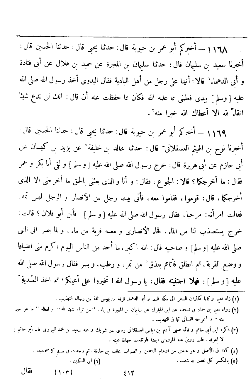١١٦٩ - أَخْبَرَكُمْ أَبُو عُمَرَ بْنُ حَيَوَيْهِ قَالَ: حَدَّثَنَا يَحْيَى قَالَ: حَدَّثَنَا الْحُسَيْنُ، قَالَ: أَخْبَرَنَا نُوحُ بْنُ الْهَيْثَمِ الْعَسْقَلَانِيُّ قَالَ: حَدَّثَنَا خَالِدُ بْنُ خَلِيفَةَ، عَنْ يَزِيدَ بْنِ كَيْسَانَ، عَنْ أَبِي حَازِمٍ، عَنْ أَبِي هُرَيْرَةَ قَالَ: خَرَجَ رَسُولُ اللَّهِ صَلَّى اللهُ عَلَيْهِ وَسَلَّمَ وَلَقِيَ أَبَا بَكْرٍ، وَعُمَرَ، فَقَالَ: «مَا أَخْرَجَكُمَا؟» قَالَا: الْجُوعُ، فَقَالَ: «وَأَنَا وَالَّذِي بَعَثَنِي بِالْحَقِّ مَا أَخْرَجَنِي إِلَّا الَّذِي أَخْرَجَكُمَا» ، قَالَ: «قُومُوا» ، فَقَامُوا مَعَهُ، فَأَتَى بَيْتَ رَجُلٍ مِنَ الْأَنْصَارِ، وَالرَّجُلُ لَيْسَ ثَمَّةَ، فَقَالَتِ امْرَأَتُهُ: مَرْحَبًا، فَقَالَ رَسُولُ اللَّهِ صَلَّى اللهُ عَلَيْهِ وَسَلَّمَ: «فَأَيْنَ أَبُو فُلَانٍ؟» قَالَتْ: خَرَجَ يَسْتَعْذِبُ لَنَا مِنَ الْمَاءِ، فَجَاءَ الْأَنْصَارِيُّ وَمَعَهُ قِرْبَةٌ مِنْ مَاءٍ، وَلَمَّا بَصَرَ إِلَى النَّبِيِّ صَلَّى اللهُ عَلَيْهِ وَسَلَّمَ وَصَاحِبَيْهِ، قَالَ: اللَّهُ أَكْبَرُ، مَا أَحَدٌ مِنَ النَّاسِ الْيَوْمَ أَكْرَمَ مِنِّي أَضْيَافًا، وَوَضَعَ الْقِرْبَةَ، ثُمَّ انْطَلَقَ فَأَتَاهُمْ بِعِذْقٍ مِنْ تَمْرٍ، وَرُطَبٍ، وَبُسْرٍ، فَقَالَ رَسُولُ اللَّهِ صَلَّى اللهُ عَلَيْهِ وَسَلَّمَ: «فَهَلَّا اجْتَنَيْتَهُ» فَقَالَ: يَا رَسُولَ اللَّهِ، تَخَيَّرُوا عَلَى أَعْيُنِكُمْ، ثُمَّ أَخَذَ الْمُدْيَةَ ⦗٤١٣⦘، فَقَالَ رَسُولُ اللَّهِ صَلَّى اللهُ عَلَيْهِ وَسَلَّمَ: «إِيَّاكَ وَالْحَلُوبَ» ، فَذَبَحَ لَهُمْ شَاةً، فَأَكَلُوا وَشَرِبُوا، فَقَالَ رَسُولُ اللَّهِ صَلَّى اللهُ عَلَيْهِ وَسَلَّمَ: «وَالَّذِي نَفْسِي بِيَدِهِ، لَتُسْأَلُنَّ عَنْ هَذَا النَّعِيمِ يَوْمَ الْقِيَامَةِ، أَخْرَجَكُمْ مِنْ بُيُوتِكُمُ الْجُوعُ، فَلَمْ تَرْجِعُوا حَتَّى أَصَبْتُمْ هَذَا النَّعِيمَ»