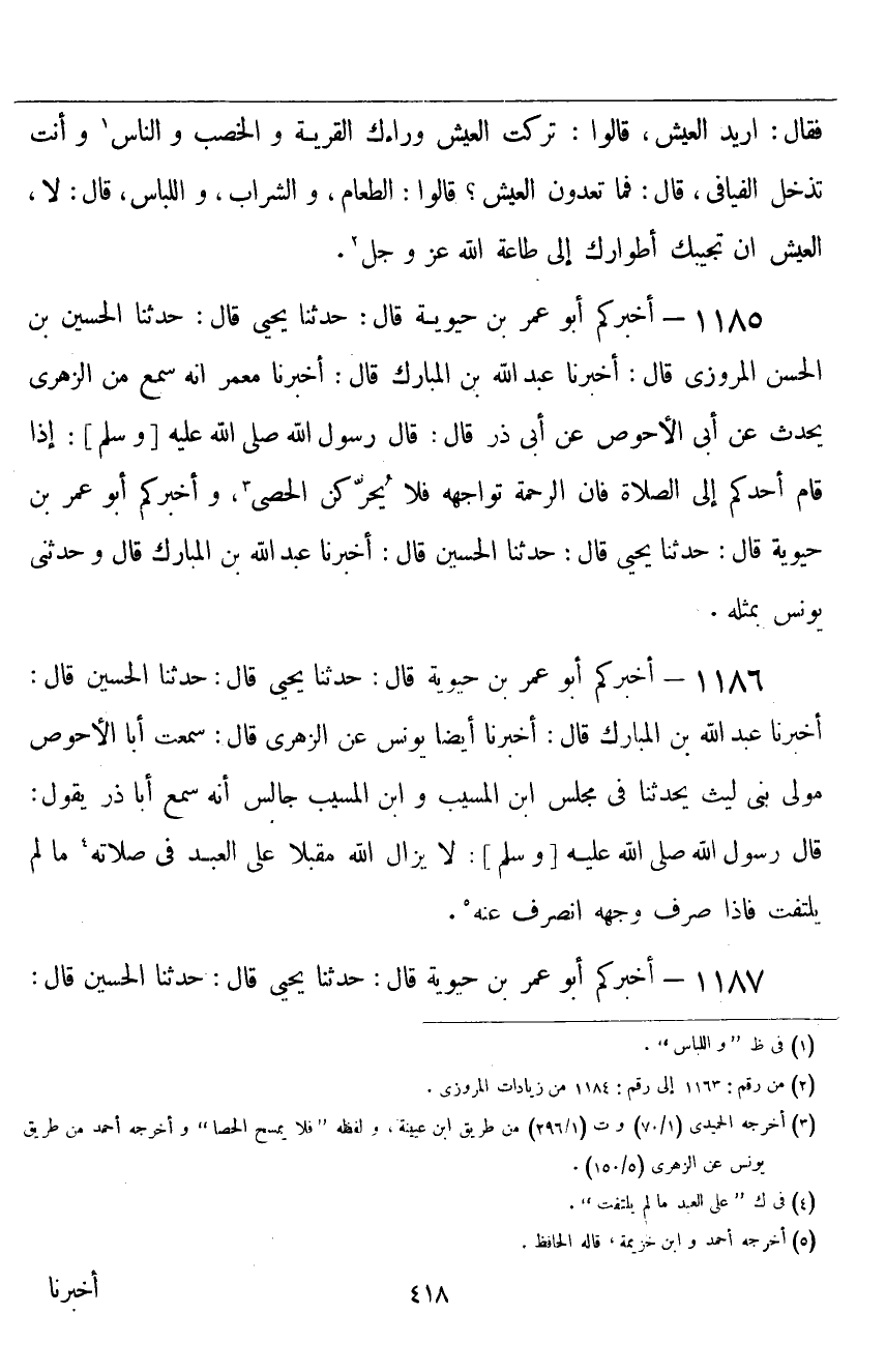١١٨٥ - أَخْبَرَكُمْ أَبُو عُمَرَ بْنُ حَيَوَيْهِ قَالَ: حَدَّثَنَا يَحْيَى قَالَ: حَدَّثَنَا الْحُسَيْنُ بْنُ الْحَسَنِ الْمَرْوَزِيُّ قَالَ: أَخْبَرَنَا عَبْدُ اللَّهِ بْنُ الْمُبَارَكِ قَالَ: أَخْبَرَنَا مَعْمَرٌ، أَنَّهُ سَمِعَ مِنَ الزُّهْرِيِّ يُحَدِّثُ عَنْ أَبِي الْأَحْوَصِ، عَنْ أَبِي ذَرٍّ قَالَ: قَالَ رَسُولُ اللَّهِ صَلَّى اللهُ عَلَيْهِ وَسَلَّمَ: «إِذَا قَامَ أَحَدُكُمْ إِلَى الصَّلَاةِ، فَإِنَّ الرَّحْمَةَ تُوَاجِهُهُ، فَلَا يُحَرِّكَنَّ الْحَصَى» وَأَخْبَرَكُمْ أَبُو عُمَرَ بْنُ حَيَوَيْهِ قَالَ: حَدَّثَنَا يَحْيَى قَالَ: حَدَّثَنَا الْحُسَيْنُ قَالَ: أَخْبَرَنَا عَبْدُ اللَّهِ بْنُ الْمُبَارَكِ قَالَ: وَحَدَّثَنِي يُونُسُ بِمِثْلِهِ