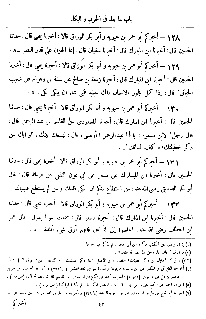 ١٢٨ - أَخْبَرَكُمْ أَبُو عُمَرَ بْنُ حَيَوَيْهِ، وَأَبُو بَكْرٍ الْوَرَّاقُ قَالَا: أَخْبَرَنَا يَحْيَى قَالَ: حَدَّثَنَا الْحُسَيْنُ قَالَ: أَخْبَرَنَا ابْنُ الْمُبَارَكِ قَالَ: أَخْبَرَنَا سُفْيَانُ قَالَ: «إِنَّمَا الْحُزْنُ عَلَى قَدْرِ الْبَصَرِ»