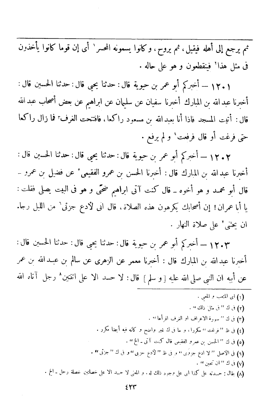 ١٢٠١ - أَخْبَرَكُمْ أَبُو عُمَرَ بْنُ حَيَوَيْهِ قَالَ: حَدَّثَنَا يَحْيَى قَالَ: حَدَّثَنَا الْحُسَيْنُ قَالَ: أَخْبَرَنَا عَبْدُ اللَّهِ بْنُ الْمُبَارَكِ قَالَ: أَخْبَرَنَا سُفْيَانُ، عَنْ سُلَيْمَانَ، عَنْ إِبْرَاهِيمَ، عَنْ بَعْضِ أَصْحَابِ عَبْدِ اللَّهِ، قَالَ: «أَتَيْتُ الْمَسْجِدَ، فَإِذَا أَنَا بِعَبْدِ اللَّهِ بْنِ مَسْعُودٍ رَاكِعًا، فَافْتَتَحْتُ الْغُرَفَ، فَمَا زَالَ رَاكِعًا حَتَّى فَرَغْتُ» ، أَوْ قَالَ: فَرَفَعْتُ وَلَمْ يَرْفَعْ