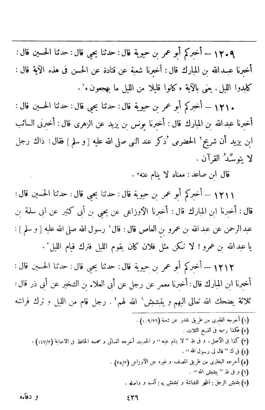 ١٢١١ - أَخْبَرَكُمْ أَبُو عُمَرَ بْنُ حَيَوَيْهِ قَالَ: حَدَّثَنَا يَحْيَى قَالَ: حَدَّثَنَا الْحُسَيْنُ قَالَ: أَخْبَرَنَا ابْنُ الْمُبَارَكِ قَالَ: أَخْبَرَنَا الْأَوْزَاعِيُّ، عَنْ يَحْيَى بْنِ أَبِي كَثِيرٍ، عَنْ أَبِي سَلَمَةَ بْنِ عَبْدِ الرَّحْمَنِ، عَنْ عَبْدِ اللَّهِ بْنِ عَمْرِو بْنِ الْعَاصِ قَالَ: قَالَ رَسُولُ اللَّهِ صَلَّى اللهُ عَلَيْهِ وَسَلَّمَ: «يَا عَبْدَ اللَّهِ بْنَ عَمْرٍو، لَا تَكُنْ مِثْلَ فُلَانٍ كَانَ يَقُومُ اللَّيْلَ، فَتَرَكَ قِيَامَ اللَّيْلِ»