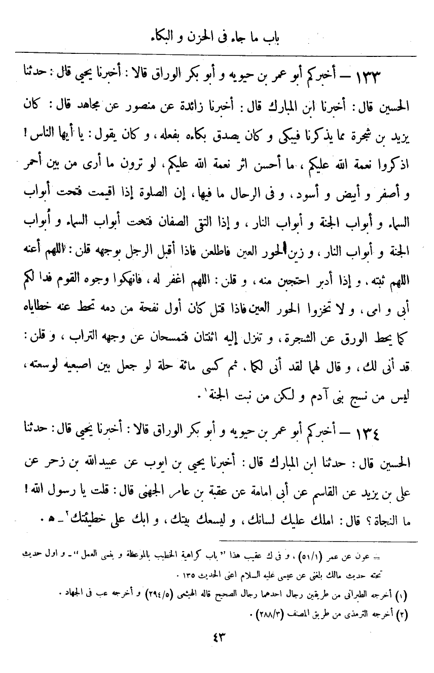 ١٣٤ - أَخْبَرَكُمْ أَبُو عُمَرَ بْنُ حَيَوَيْهِ، وَأَبُو بَكْرٍ الْوَرَّاقُ قَالَا: أَخْبَرَنَا يَحْيَى قَالَ: حَدَّثَنَا الْحُسَيْنُ قَالَ: حَدَّثَنَا ابْنُ الْمُبَارَكِ قَالَ: أَخْبَرَنَا يَحْيَى بْنُ أَيُّوبَ، عَنْ عُبَيْدِ اللَّهِ بْنِ زَحْرٍ، عَنْ عَلِيِّ بْنِ يَزِيدَ، عَنِ الْقَاسِمِ، عَنْ أَبِي أُمَامَةَ، عَنْ عُقْبَةَ بْنِ عَامِرٍ الْجُهَنِيِّ قَالَ: قُلْتُ: يَا رَسُولَ اللَّهِ، مَا النَّجَاةُ؟ قَالَ: «أَمْلِكْ عَلَيْكَ لِسَانَكَ، وَلْيَسَعْكَ بَيْتُكَ، وَابْكِ عَلَى خَطِيئَتِكَ»