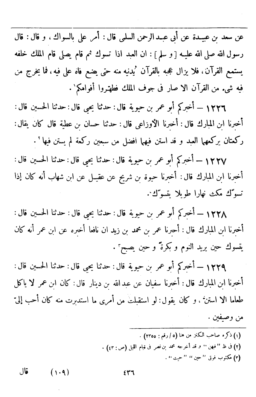 ١٢٢٨ - أَخْبَرَكُمْ أَبُو عُمَرَ بْنُ حَيَوَيْهِ قَالَ: حَدَّثَنَا يَحْيَى قَالَ: حَدَّثَنَا الْحُسَيْنُ قَالَ: أَخْبَرَنَا ابْنُ الْمُبَارَكِ قَالَ: أَخْبَرَنَا عُمَرُ بْنُ مُحَمَّدِ بْنِ زَيْدٍ، أَنَّ نَافِعًا، أَخْبَرَهُ، عَنِ ابْنِ عُمَرَ، «أَنَّهُ كَانَ يَتَسَوَّكُ حِينَ يُرِيدُ النَّوْمَ، وَبُكْرَةً، وَحِينَ يُصْبِحُ»