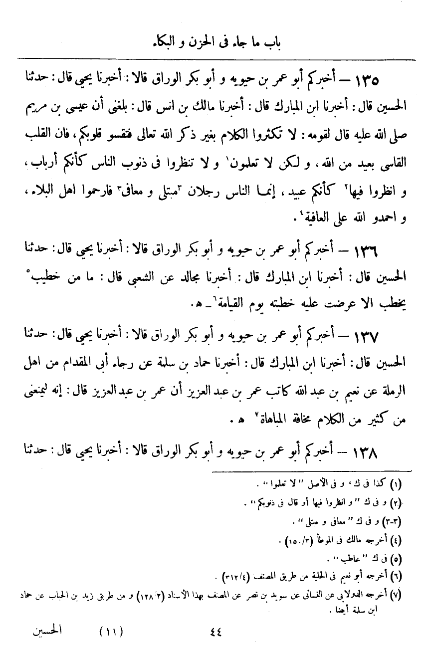 ١٣٥ - أَخْبَرَكُمْ أَبُو عُمَرَ بْنُ حَيَوَيْهِ، وَأَبُو بَكْرٍ الْوَرَّاقُ قَالَا: أَخْبَرَنَا يَحْيَى قَالَ: حَدَّثَنَا الْحُسَيْنُ قَالَ: أَخْبَرَنَا ابْنُ الْمُبَارَكِ قَالَ: أَخْبَرَنَا مَالِكُ بْنُ أَنَسٍ قَالَ: بَلَغَنِي، أَنَّ عِيسَى ابْنَ مَرْيَمَ صَلَّى اللَّهُ عَلَيْهِ قَالَ لِقَوْمِهِ: «لَا تُكْثِرُوا الْكَلَامَ بِغَيْرِ ذِكْرِ اللَّهِ تَعَالَى فَتَقْسُوَ قُلُوبُكُمْ، فَإِنَّ الْقَلْبَ الْقَاسِيَ بَعِيدٌ مِنَ اللَّهِ، وَلَكِنْ لَا تَعْلَمُونَ، وَلَا تَنْظُرُوا فِي ذُنُوبِ النَّاسِ كَأَنَّكُمْ أَرْبَابٌ، وَانْظُرُوا فِيهَا كَأَنَّكُمْ عَبِيدٌ، إِنَّمَا النَّاسُ رَجُلَانِ مُبْتَلًى وَمُعَافًى، فَارْحَمُوا أَهْلَ الْبَلَاءِ، وَاحْمَدُوا اللَّهَ عَلَى الْعَافِيَةِ»