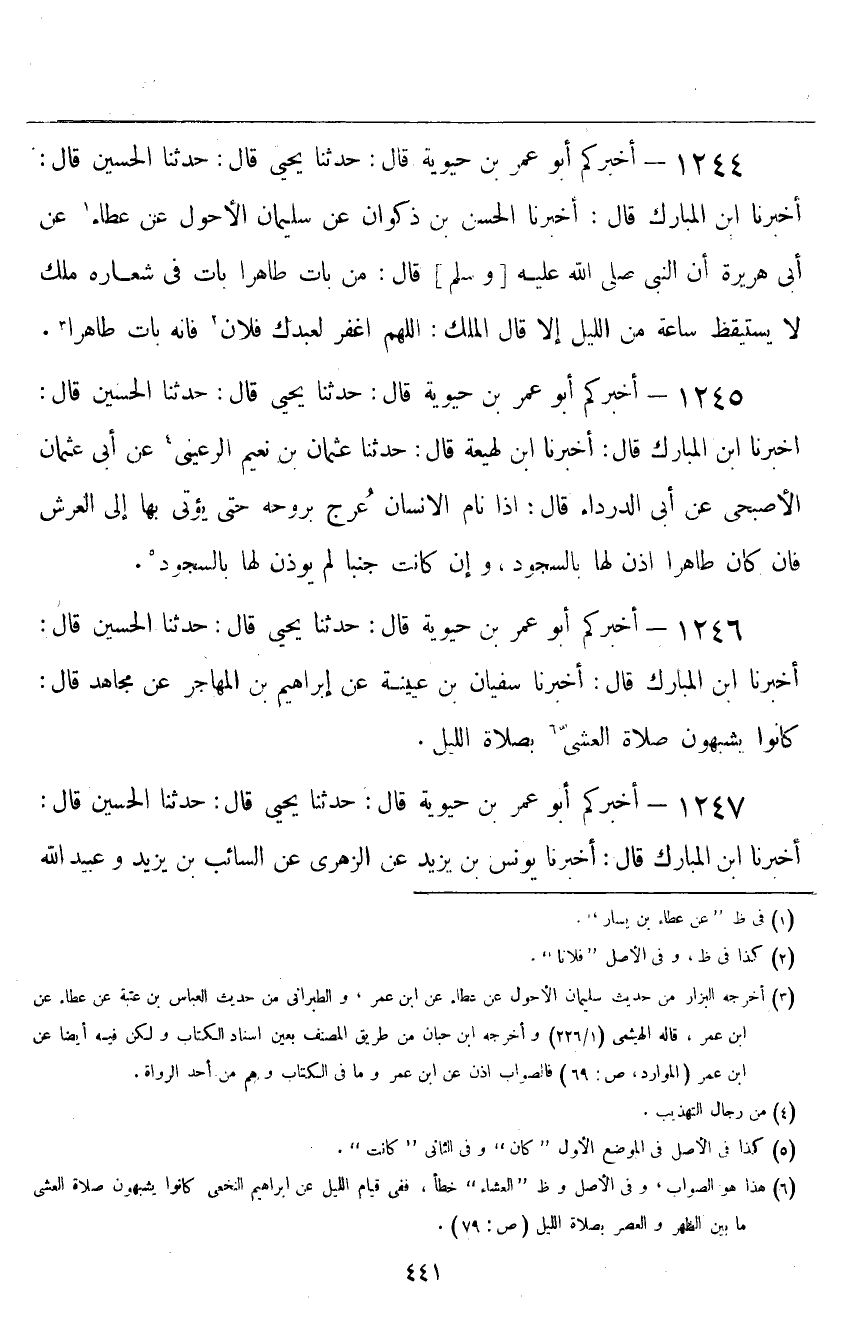 ١٢٤٦ - أَخْبَرَكُمْ أَبُو عُمَرَ بْنُ حَيَوَيْهِ قَالَ: حَدَّثَنَا يَحْيَى قَالَ: حَدَّثَنَا الْحُسَيْنُ قَالَ: أَخْبَرَنَا ابْنُ الْمُبَارَكِ قَالَ: أَخْبَرَنَا سُفْيَانُ بْنُ عُيَيْنَةَ، عَنْ إِبْرَاهِيمَ بْنِ الْمُهَاجِرِ، عَنْ مُجَاهِدٍ قَالَ: «كَانُوا يُشَبِّهُونَ صَلَاةَ الْعَشِيِّ بِصَلَاةِ اللَّيْلِ»