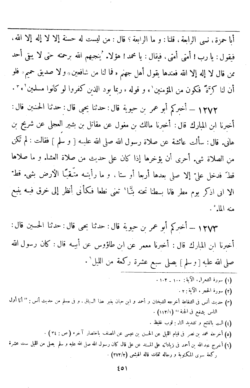 ١٢٧٢ - أَخْبَرَكُمْ أَبُو عُمَرَ بْنُ حَيَوَيْهِ قَالَ: حَدَّثَنَا يَحْيَى قَالَ: حَدَّثَنَا الْحُسَيْنُ قَالَ: أَخْبَرَنَا ابْنُ الْمُبَارَكِ قَالَ: أَخْبَرَنَا مَالِكُ بْنُ مِغْوَلٍ، عَنْ مُقَاتِلِ بْنِ بَشِيرٍ الْعِجْلِيِّ، عَنْ شُرَيْحِ بْنِ هَانِئٍ قَالَ: سَأَلْتُ عَائِشَةَ عَنْ صَلَاةِ رَسُولِ اللَّهِ صَلَّى اللهُ عَلَيْهِ وَسَلَّمَ، فَقَالَتْ: «لَمْ تَكُنْ مِنَ الصَّلَاةِ شَيْءٌ أَحْرَى أَنْ يُؤَخِّرَهَا إِذَا كَانَ عَلَى حَدِيثٍ مِنْ صَلَاةِ الْعِشَاءِ، وَمَا صَلَّاهَا قَطُّ فَدَخَلَ عَلَيَّ، إِلَّا صَلَّى بَعْدَهَا أَرْبَعًا أَوْ سِتًّا، وَمَا رَأَيْتُهُ مُتَّقِيًا الْأَرْضَ بِشَيْءٍ قَطُّ، إِلَّا أَنِّي أَذْكُرُ يَوْمَ مَطَرٍ، فَإِنَّا بَسَطْنَا تَحْتَهُ بَتًّا - تَعْنِي نِطَعًا - فَكَأَنِّي أَنْظُرُ إِلَى خَرْقٍ فِيهِ يَنْبُعُ مِنْهُ الْمَاءُ»
