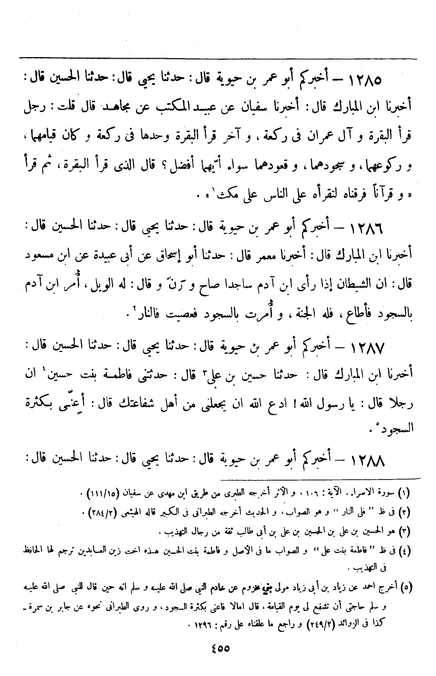 ١٢٨٧ - أَخْبَرَكُمْ أَبُو عُمَرَ بْنُ حَيَوَيْهِ قَالَ: حَدَّثَنَا يَحْيَى قَالَ: حَدَّثَنَا الْحُسَيْنُ قَالَ: أَخْبَرَنَا ابْنُ الْمُبَارَكِ قَالَ: حَدَّثَنَا حُسَيْنُ بْنُ عَلِيٍّ قَالَ: حَدَّثَتْنِي فَاطِمَةُ بِنْتُ حُسَيْنٍ، أَنَّ رَجُلًا قَالَ: يَا رَسُولَ اللَّهِ، ادْعُ اللَّهَ أَنْ يَجْعَلَنِي مِنْ أَهْلِ شَفَاعَتِكَ، قَالَ: «أَعِنِّي بِكَثْرَةِ السُّجُودِ»