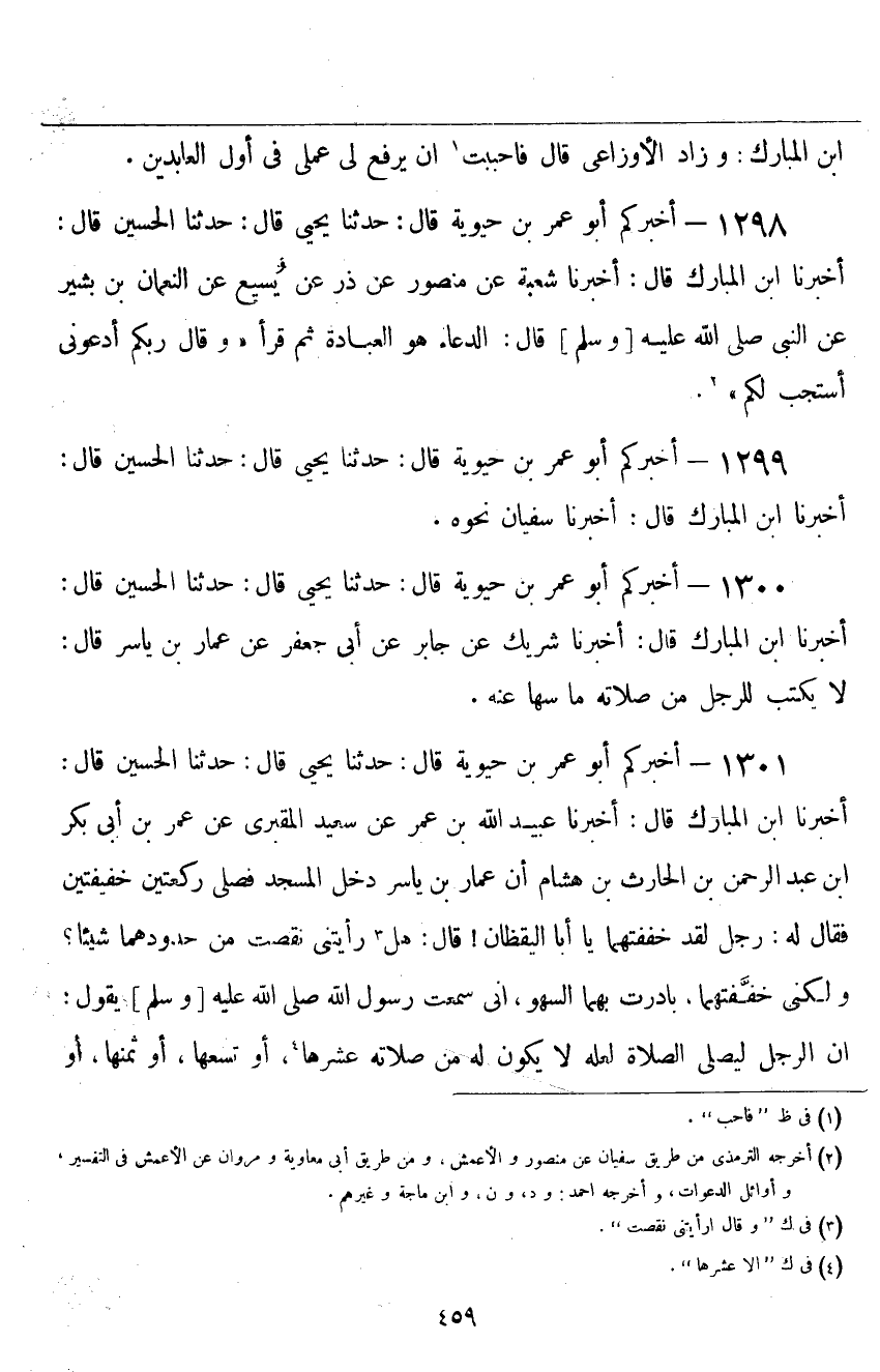١٢٩٩ - أَخْبَرَكُمْ أَبُو عُمَرَ بْنُ حَيَوَيْهِ قَالَ: حَدَّثَنَا يَحْيَى قَالَ: حَدَّثَنَا الْحُسَيْنُ قَالَ: أَخْبَرَنَا ابْنُ الْمُبَارَكِ قَالَ: أَخْبَرَنَا سُفْيَانُ، نَحْوَهُ