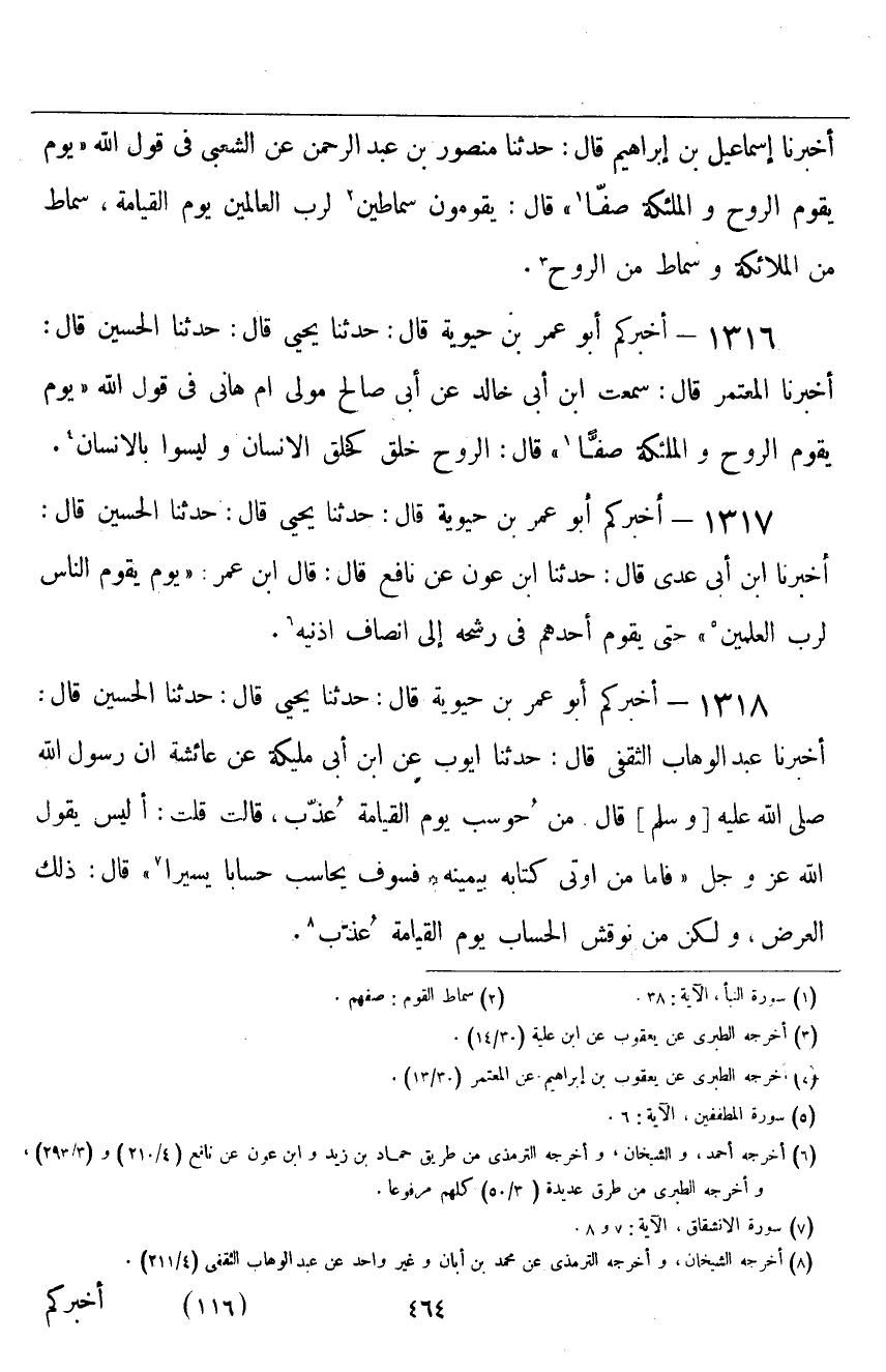 ١٣١٦ - أَخْبَرَكُمْ أَبُو عُمَرَ بْنُ حَيَوَيْهِ قَالَ: حَدَّثَنَا يَحْيَى قَالَ: حَدَّثَنَا الْحُسَيْنُ قَالَ: أَخْبَرَنَا الْمُعْتَمِرُ، قَالَ سَمِعْتُ ابْنَ أَبِي خَالِدٍ، عَنْ أَبِي صَالِحٍ، مَوْلَى أُمِّ هَانِئٍ فِي قَوْلِ اللَّهِ: {يَوْمَ يَقُومُ الرُّوحُ وَالْمَلَائِكَةُ صَفًّا} [النبأ: ٣٨] قَالَ: «الرُّوحُ خَلْقٌ كَخَلْقِ الْإِنْسَانِ وَلَيْسُوا بِالْإِنْسَانِ»