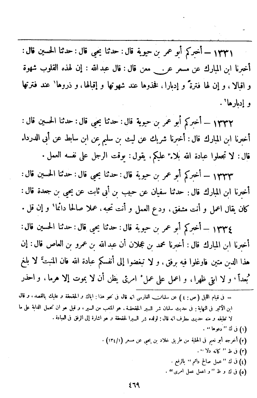 ١٣٣١ - أَخْبَرَكُمْ أَبُو عُمَرَ بْنُ حَيَوَيْهِ قَالَ: حَدَّثَنَا يَحْيَى قَالَ: حَدَّثَنَا الْحُسَيْنُ قَالَ: أَخْبَرَنَا ابْنُ المُبَارَكِ قَالَ: عَنْ مِسْعَرٍ، عَنْ مَعْنٍ قَالَ: قَالَ عَبْدُ اللَّهِ: «إِنَّ لِهَذِهِ الْقُلُوبِ شَهْوَةً وَإِقْبَالًا، وَإِنَّ لَهَا فَتْرَةً وَإِدْبَارًا، فَخُذُوهَا عِنْدَ شَهْوَتِهَا وَإِقْبَالِهَا، وَذَرُوهَا عِنْدَ فَتْرَتِهَا وَإِدْبَارِهَا»