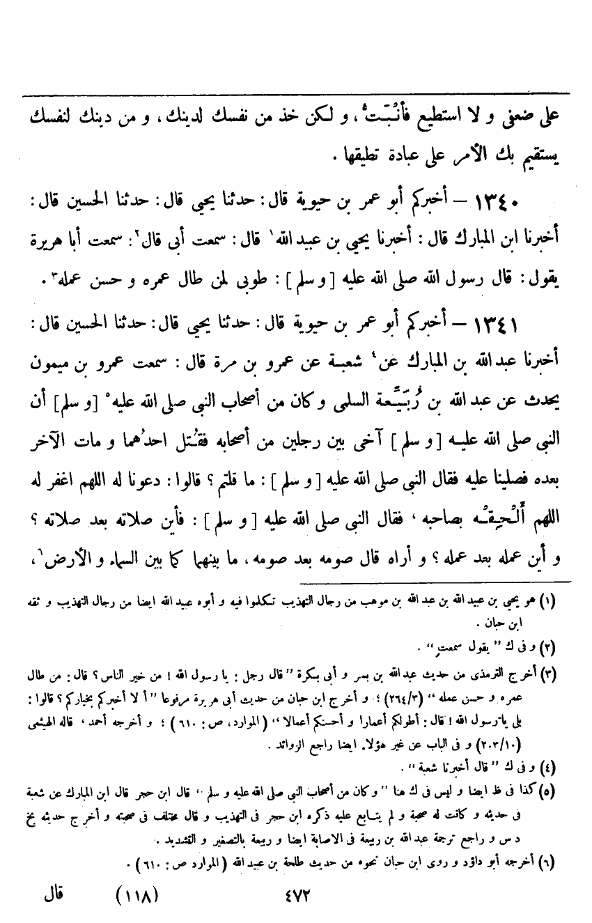 ١٣٤٠ - أَخْبَرَكُمْ أَبُو عُمَرَ بْنُ حَيَوَيْهِ قَالَ: حَدَّثَنَا يَحْيَى قَالَ: حَدَّثَنَا الْحُسَيْنُ قَالَ: أَخْبَرَنَا ابْنُ المُبَارَكِ قَالَ: أَخْبَرَنَا يَحْيَى بْنُ عُبَيْدِ اللَّهِ قَالَ: سَمِعْتُ أَبِي قَالَ: سَمِعْتُ أَبَا هُرَيْرَةَ يَقُولُ: قَالَ رَسُولُ اللَّهِ صَلَّى اللهُ عَلَيْهِ وَسَلَّمَ: «طُوبَى لِمَنْ طَالَ عُمْرُهُ، وَحَسُنَ عَمَلُهُ»