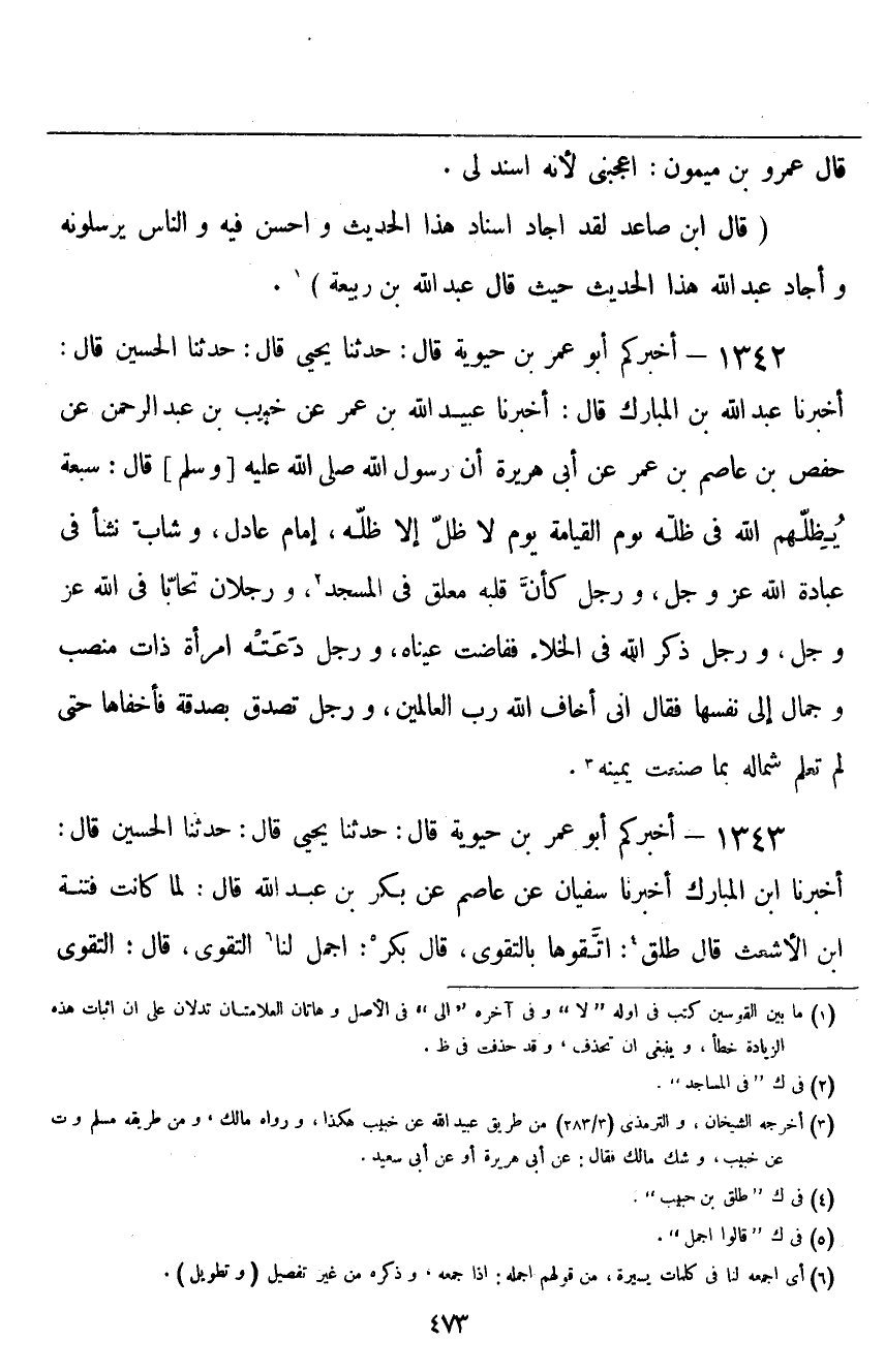 ١٣٤٢ - أَخْبَرَكُمْ أَبُو عُمَرَ بْنُ حَيَوَيْهِ قَالَ: حَدَّثَنَا يَحْيَى قَالَ: حَدَّثَنَا الْحُسَيْنُ قَالَ: أَخْبَرَنَا عَبْدُ اللَّهِ بْنُ المُبَارَكِ قَالَ: أَخْبَرَنَا عُبَيْدُ اللَّهِ بْنُ عُمَرَ، عَنْ خُبَيْبِ بْنِ عَبْدِ الرَّحْمَنِ، عَنْ حَفْصِ بْنِ عَاصِمِ بْنِ عُمَرَ، عَنْ أَبِي هُرَيْرَةَ، أَنَّ رَسُولَ اللَّهِ صَلَّى اللهُ عَلَيْهِ وَسَلَّمَ قَالَ: " سَبْعَةٌ يُظِلُّهُمُ اللَّهُ فِي ظِلِّهِ يَوْمَ الْقِيَامَةِ، يَوْمَ لَا ظِلَّ إِلَّا ظِلُّهُ، إِمَامٌ عَادِلٌ، وَشَابٌّ نَشَأَ فِي عِبَادَةِ اللَّهِ عَزَّ وَجَلَّ، وَرَجُلٌ كَانَ قَلْبُهُ مُعَلَّقٌ فِي الْمَسْجِدِ، وَرَجُلَانِ تَحَابَّا فِي اللَّهِ عَزَّ وَجَلَّ، وَرَجُلٌ ذَكَرَ اللَّهَ فِي الْخَلَاءِ فَفَاضَتْ عَيْنَاهُ، وَرَجُلٌ دَعَتْهُ امْرَأَةٌ ذَاتُ مَنْصِبٍ وَجَمَالٍ إِلَى نَفْسِهَا، فَقَالَ: إِنِّي أَخَافُ اللَّهَ رَبَّ الْعَالَمِينَ، وَرَجُلٌ تَصَدَّقَ بِصَدَقَةٍ فَأَخْفَاهَا حَتَّى لَمْ تَعْلَمْ شِمَالُهُ بِمَا صَنَعَتْ يَمِينُهُ "