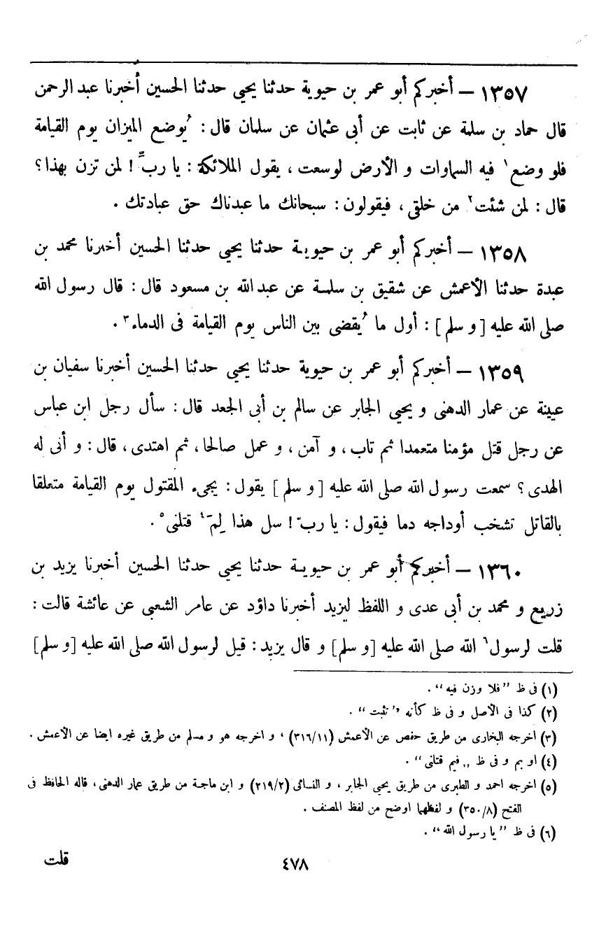 ١٣٥٨ - أَخْبَرَكُمْ أَبُو عُمَرَ بْنُ حَيَوَيْهِ قَالَ: حَدَّثَنَا يَحْيَى، حَدَّثَنَا الْحُسَيْنُ، أَخْبَرَنَا مُحَمَّدُ بْنُ عَبْدَةَ، حَدَّثَنَا الْأَعْمَشُ، عَنْ شَقِيقِ بْنِ سَلَمَةَ، عَنْ عَبْدِ اللَّهِ بْنِ مَسْعُودٍ قَالَ: قَالَ رَسُولُ اللَّهِ صَلَّى اللهُ عَلَيْهِ وَسَلَّمَ: «أَوَّلُ مَا يُقْضَى بَيْنَ النَّاسِ يَوْمَ الْقِيَامَةِ فِي الدِّمَاءِ»