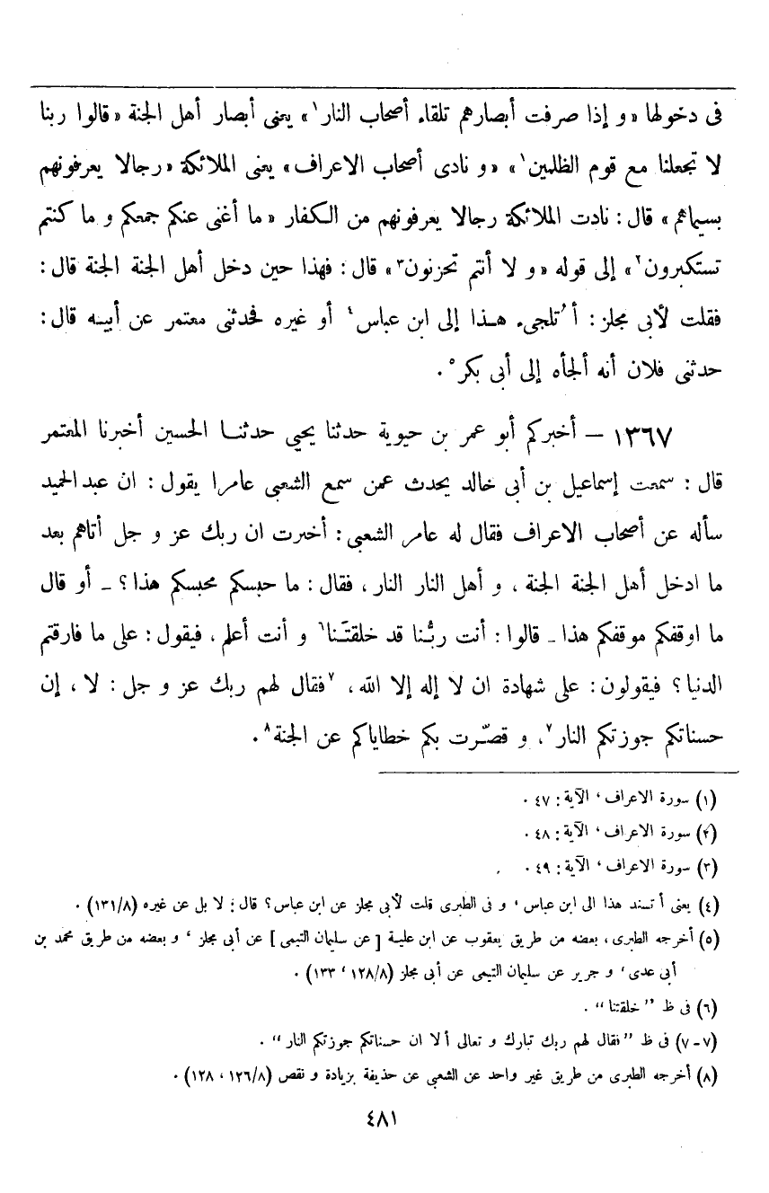 ١٣٦٧ - أَخْبَرَكُمْ أَبُو عُمَرَ بْنُ حَيَوَيْهِ قَالَ: حَدَّثَنَا يَحْيَى، حَدَّثَنَا الْحُسَيْنُ، أَخْبَرَنَا الْمُعْتَمِرُ قَالَ: سَمِعْتُ إِسْمَاعِيلَ بْنَ أَبِي خَالِدٍ يُحَدِّثُ عَمَّنْ سَمِعَ الشَّعْبِيَّ عَامِرًا يَقُولُ: إِنَّ عَبْدَ الْحَمِيدِ سَأَلَهُ عَنْ أَصْحَابِ الْأَعْرَافِ، فَقَالَ لَهُ عَامِرٌ الشَّعْبِيُّ: أُخْبِرْتُ أَنَّ رَبَّكَ عَزَّ وَجَلَّ أَتَاهُمْ بَعْدَمَا أَدْخَلَ أَهْلَ الْجَنَّةِ الْجَنَّةَ، وَأَهْلَ النَّارِ النَّارَ، فَقَالَ: مَا حَبَسَكُمْ مَحْبَسَكُمْ هَذَا؟ أَوْ قَالَ: مَا أَوْقَفَكُمْ مَوْقِفَكُمْ هَذَا؟ قَالُوا: أَنْتَ رَبُّنَا قَدْ خَلَقْتَنَا وَأَنْتَ أَعْلَمُ، فَيَقُولُ: عَلَى مَا فَارَقْتُمُ الدُّنْيَا؟ فَيَقُولُونَ: عَلَى شَهَادَةِ أَنْ لَا إِلَهَ إِلَّا اللَّهُ، فَقَالَ لَهُمْ رَبُّكَ عَزَّ وَجَلَّ: لَا، إِنَّ حَسَنَاتِكُمْ جَوَّزَتْكُمُ النَّارَ، وَقَصُرَتْ بِكُمْ خَطَايَاكُمْ عَنِ الْجَنَّةِ "