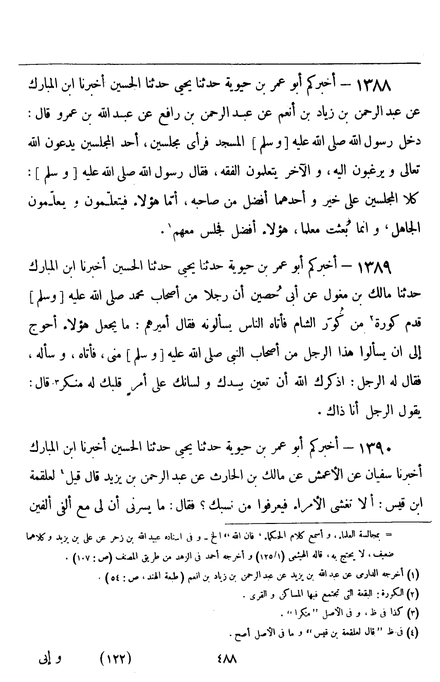 ١٣٨٨ - أَخْبَرَكُمْ أَبُو عُمَرَ بْنُ حَيَوَيْهِ قَالَ: حَدَّثَنَا يَحْيَى، حَدَّثَنَا الْحُسَيْنُ، أَخْبَرَنَا ابْنُ الْمُبَارَكِ، عَنْ عَبْدِ الرَّحْمَنِ بْنِ زِيَادِ بْنِ أَنْعُمٍ، عَنْ عَبْدِ الرَّحْمَنِ بْنِ رَافِعٍ، عَنْ عَبْدِ اللَّهِ بْنِ عَمْرٍو قَالَ: دَخَلَ رَسُولُ اللَّهِ صَلَّى اللهُ عَلَيْهِ وَسَلَّمَ الْمَسْجِدَ فَرَأَى مَجْلِسَيْنِ: أَحَدُ الْمَجْلِسَيْنِ يَدْعُونَ اللَّهَ تَعَالَى، وَيَرْغَبُونَ إِلَيْهِ، وَالْآخَرُ يَتَعَلَّمُونَ الْفِقْهَ، فَقَالَ رَسُولُ اللَّهِ صَلَّى اللهُ عَلَيْهِ وَسَلَّمَ: «كِلَا الْمَجْلِسَيْنِ عَلَى خَيْرٍ، وَأَحَدُهُمَا أَفْضَلُ مِنْ صَاحِبِهِ، أَمَّا هَؤُلَاءِ فَيَتَعَلَّمُونَ وَيُعَلِّمُونَ الْجَاهِلَ، وَإِنَّمَا بُعِثْتُ مُعَلِّمًا، هَؤُلَاءِ أَفْضَلُ، فَجَلَسَ مَعَهُمْ»