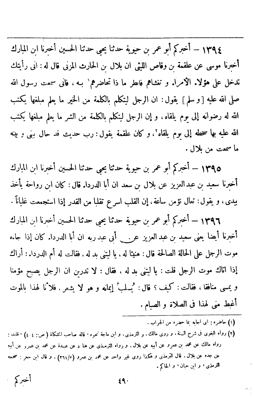 ١٣٩٤ - أَخْبَرَكُمْ أَبُو عُمَرَ بْنُ حَيَوَيْهِ قَالَ: حَدَّثَنَا يَحْيَى، حَدَّثَنَا الْحُسَيْنُ، أَخْبَرَنَا ابْنُ الْمُبَارَكِ، أَخْبَرَنَا مُوسَى، عَنْ عَلْقَمَةَ بْنِ وَقَّاصٍ اللَّيْثِيِّ، أَنَّ بِلَالَ بْنَ الْحَارِثِ الْمُزَنِيَّ، قَالَ لَهُ: إِنِّي رَأَيْتُكَ تَدْخُلُ عَلَى هَؤُلَاءِ الْأُمَرَاءِ وَتَغْشَاهُمْ فَانْظُرْ مَاذَا تُحَاضِرُهُمْ بِهِ، فَإِنِّي سَمِعْتُ رَسُولَ اللَّهِ صَلَّى اللهُ عَلَيْهِ وَسَلَّمَ يَقُولُ: «إِنَّ الرَّجُلَ لَيَتَكَلَّمُ بِالْكَلِمَةِ مِنَ الْخَيْرِ مَا يَعْلَمُ مَبْلَغَهَا، يَكْتُبُ اللَّهُ لَهُ رِضْوَانَهُ إِلَى يَوْمِ يَلْقَاهُ، وَإِنَّ الرَّجُلَ لَيَتَكَلَّمُ بِالْكَلِمَةِ مِنَ الشَّرِّ مَا يَعْلَمُ مَبْلَغَهَا، يَكْتُبُ اللَّهُ عَلَيْهِ بِهَا سَخَطَهُ إِلَى يَوْمِ يَلْقَاهُ» ، وَكَانَ عَلْقَمَةُ يَقُولُ: رُبَّ حَدِيثٍ قَدْ حَالَ بَيْنِي وَبَيْنَهُ مَا سَمِعْتُ مِنْ بِلَالٍ