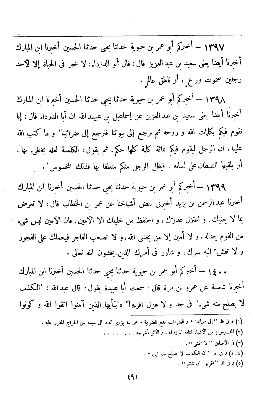 ١٣٩٧ - أَخْبَرَكُمْ أَبُو عُمَرَ بْنُ حَيَوَيْهِ قَالَ: حَدَّثَنَا يَحْيَى، حَدَّثَنَا الْحُسَيْنُ، أَخْبَرَنَا ابْنُ الْمُبَارَكِ، أَخْبَرَنَا أَيْضًا، يَعْنِي سَعِيدَ بْنَ عَبْدِ الْعَزِيزِ قَالَ: قَالَ أَبُو الدَّرْدَاءِ: " لَا خَيْرَ فِي الْحَيَاةِ إِلَّا لِأَحَدِ رَجُلَيْنِ: صَمُوتٍ وَرِعٍ، أَوْ نَاطِقٍ عَالِمٍ "