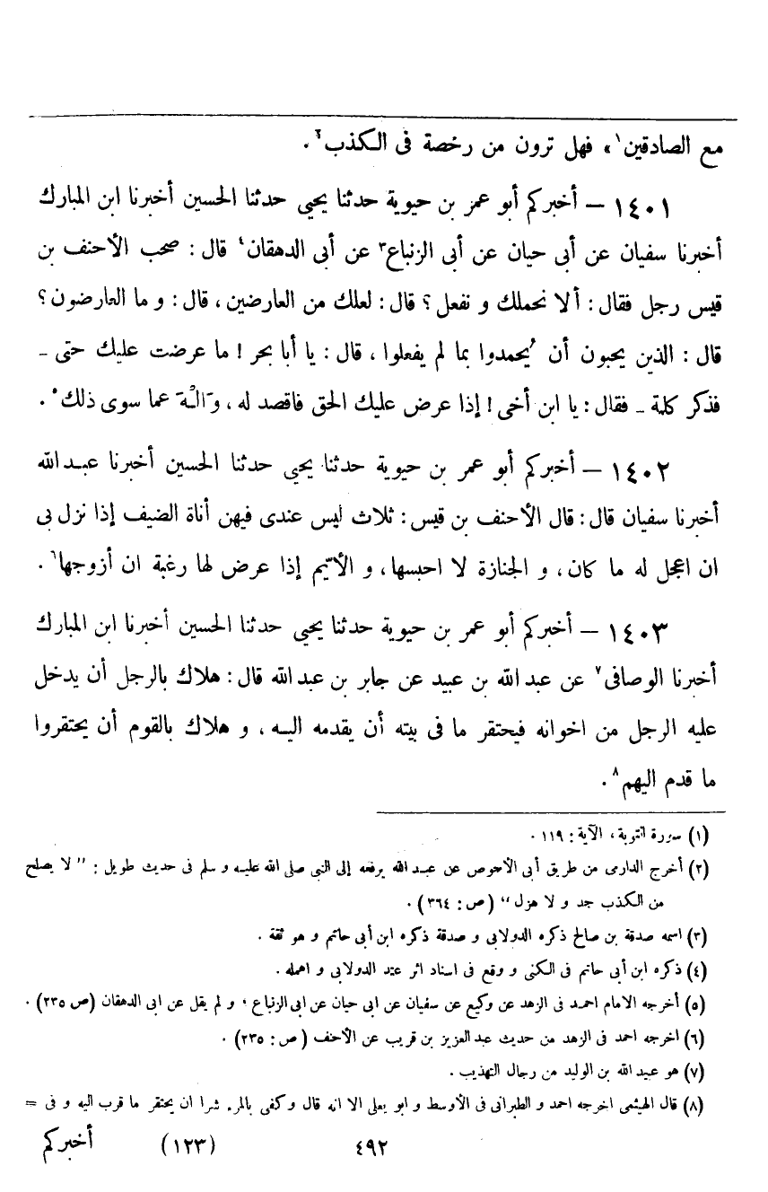 ١٤٠١ - أَخْبَرَكُمْ أَبُو عُمَرَ بْنُ حَيَوَيْهِ قَالَ: حَدَّثَنَا يَحْيَى، حَدَّثَنَا الْحُسَيْنُ، أَخْبَرَنَا ابْنُ الْمُبَارَكِ، أَخْبَرَنَا سُفْيَانُ، عَنْ أَبِي حَيَّانَ، عَنْ أَبِي الزِّنْبَاعِ، عَنْ أَبِي الدِّهْقَانِ قَالَ: صَحِبَ الْأَحْنَفَ بْنَ قَيْسٍ رَجُلٌ، فَقَالَ: أَلَا نَحْمِلُكَ وَنَفْعَلُ؟ قَالَ: «لَعَلَّكَ مِنَ الْعَارِضِينَ» ، قَالَ: وَمَا الْعَارِضُونَ؟ قَالَ: «الَّذِينَ يُحِبِّونَ أَنْ يُحْمَدُوا بِمَا لَمْ يَفْعَلُوا» ، قَالَ: يَا أَبَا بَحْرٍ، مَا عَرَضْتُ عَلَيْكَ حَتَّى - فَذَكَرَ كَلِمَةً - فَقَالَ: «يَا ابْنَ أَخِي، إِذَا عُرِضَ عَلَيْكَ الْحَقُّ فَاقْصُدْ لَهُ، وَالْهَ عَمَّا سِوَى ذَلِكَ»