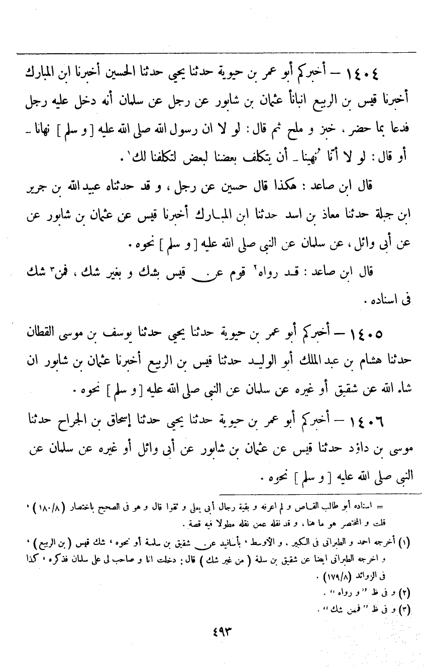 ١٤٠٤ - أَخْبَرَكُمْ أَبُو عُمَرَ بْنُ حَيَوَيْهِ قَالَ: حَدَّثَنَا يَحْيَى، حَدَّثَنَا الْحُسَيْنُ، أَخْبَرَنَا ابْنُ الْمُبَارَكِ، أَخْبَرَنَا قَيْسُ بْنُ الرَّبِيعِ، أَنْبَأَنَا عُثْمَانُ بْنُ شَابُورَ، عَنْ رَجُلٍ، عَنْ سَلْمَانَ أَنَّهُ دَخَلَ عَلَيْهِ رَجُلٌ فَدَعَا بِمَا حَضَرَ، خُبْزٍ وَمِلْحٍ، ثُمَّ قَالَ: " لَوْلَا أَنَّ رَسُولَ اللَّهِ صَلَّى اللهُ عَلَيْهِ وَسَلَّمَ نَهَانَا - أَوْ قَالَ: لَوْلَا أَنَّا نُهِينَا - أَنْ يَتَكَلَّفَ بَعْضُنَا لِبَعْضٍ لَتَكَلَّفْنَا لَكَ "، قَالَ ابْنُ صَاعِدٍ: هَكَذَا قَالَ حُسَيْنٌ: عَنْ رَجُلٍ، وَقَدْ حَدَّثَنَاهُ عُبَيْدُ اللَّهِ بْنُ جَرِيرِ بْنِ جَبَلَةَ، حَدَّثَنَا مُعَاذُ بْنُ أَسَدٍ، حَدَّثَنَا ابْنُ الْمُبَارَكِ، أَخْبَرَنَا قَيْسٌ، عَنْ عُثْمَانَ بْنِ شَابُورَ، عَنْ أَبِي وَائِلٍ، عَنْ سَلْمَانَ، عَنِ النَّبِيِّ صَلَّى اللهُ عَلَيْهِ وَسَلَّمَ نَحْوَهُ. قَالَ ابْنُ صَاعِدٍ: قَدْ رَوَاهُ قَوْمٌ عَنْ قَيْسٍ بِشَكٍّ وَبِغَيْرِ شَكٍّ، فَمَنْ شَكَّ فِي إِسْنَادِهِ: