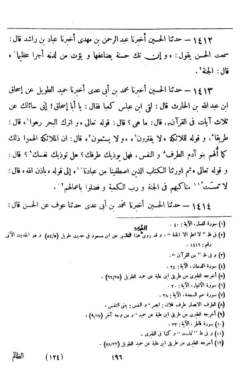١٤١٣ - حَدَّثَنَا الْحُسَيْنُ، أَخْبَرَنَا مُحَمَّدُ بْنُ أَبِي عَدِيٍّ، أَخْبَرَنَا حُمَيْدٌ الطَّوِيلُ، عَنْ إِسْحَاقَ بْنِ عَبْدِ اللَّهِ بْنِ الْحَارِثِ قَالَ: لَقِيَ ابْنُ عَبَّاسٍ كَعْبًا، فَقَالَ: يَا أَبَا إِسْحَاقَ إِنِّي سَائِلُكَ عَنْ ثَلَاثِ آيَاتٍ فِي الْقُرْآنِ، قَالَ: «مَا هِيَ؟» قَالَ: قَوْلُهُ تَعَالَى: {وَاتْرُكِ الْبَحْرَ رَهْوًا} [الدخان: ٢٤] قَالَ: «طَرِيقًا» ، وَقَوْلُهُ لِلْمَلَائِكَةِ {لَا يَفْتُرُونَ} [الأنبياء: ٢٠] {وَلَا يَسْأَمُونَ} ، قَالَ: «إِنَّ الْمَلَائِكَةَ أُلْهِمُوا ذَلِكَ كَمَا أُلْهِمَ بَنُو آدَمَ الطَّرْفُ وَالنَّفْسُ، فَهَلْ يُؤْذِيكَ طَرْفُكَ؟ هَلْ تُؤْذِيكَ نَفْسُكَ؟» قَالَ: وَقَوْلُهُ تَعَالَى: {ثُمَّ أَوْرَثْنَا الْكِتَابَ الَّذِينَ اصْطَفَيْنَا مِنْ عِبَادِنَا} [فاطر: ٣٢] إِلَى قَوْلِهِ: {بِإِذْنِ اللَّهِ} [فاطر: ٣٢] قَالَ: «لَامَسَتْ مَنَاكِبُهُمْ فِي الْجَنَّةِ وَرَبِّ الْكَعْبَةِ وَفُضِّلُوا بِأَعْمَالِهِمْ»