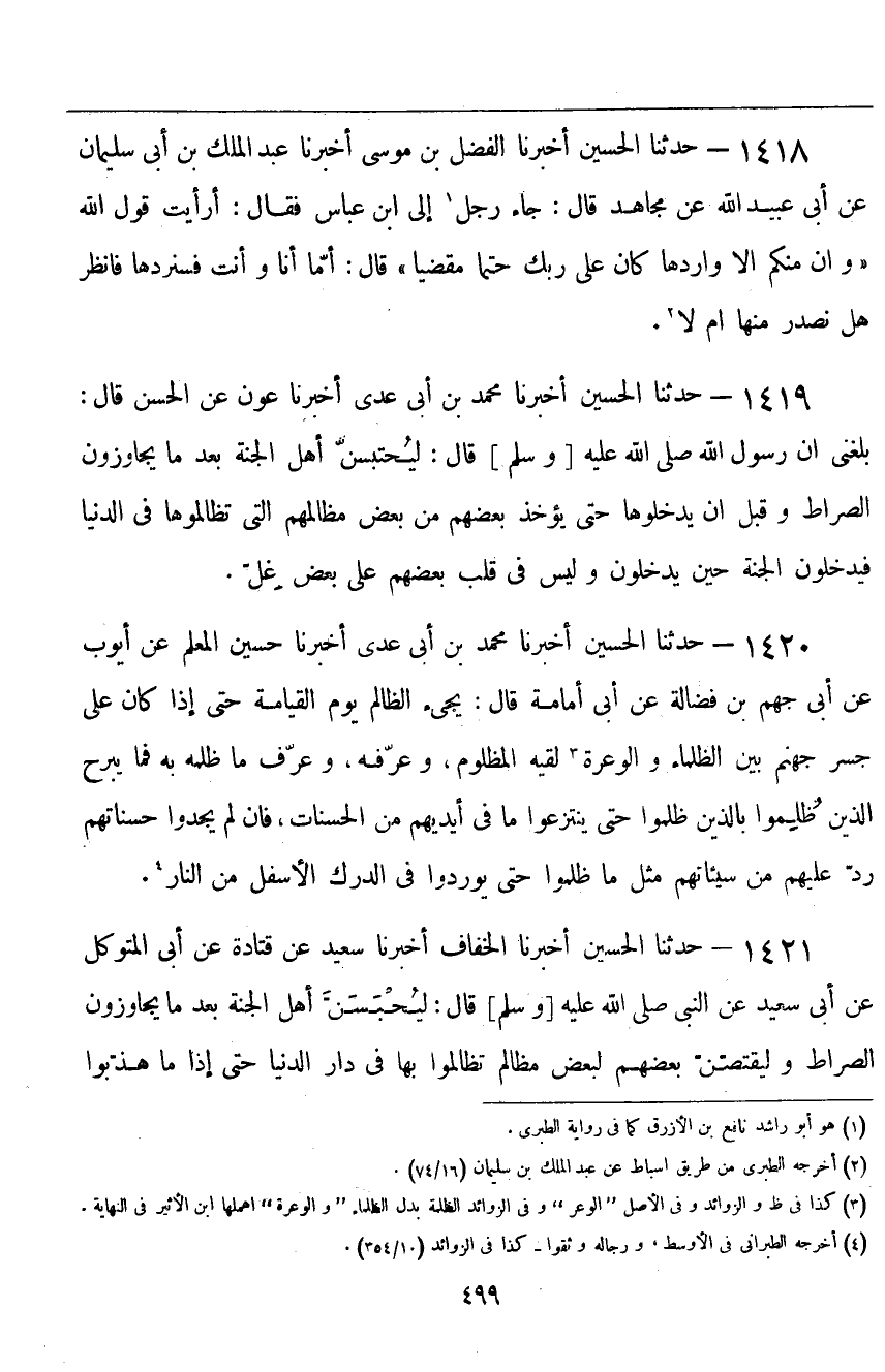 ١٤١٩ - حَدَّثَنَا الْحُسَيْنُ، أَخْبَرَنَا مُحَمَّدُ بْنُ أَبِي عَدِيٍّ، أَخْبَرَنَا عَوْفٌ، عَنِ الْحَسَنِ قَالَ: بَلَغَنِي أَنَّ رَسُولَ اللَّهِ صَلَّى اللهُ عَلَيْهِ وَسَلَّمَ قَالَ: «لَيَحْتَبِسَنَّ أَهْلُ الْجَنَّةِ بَعْدَمَا يُجَاوِزُونَ الصِّرَاطَ، وَقَبْلَ أَنْ يَدْخُلُوهَا حَتَّى يَأْخُذَ بَعْضُهُمْ مِنْ بَعْضٍ مَظَالِمَهُمُ الَّتِي تَظَالَمُوهَا فِي الدُّنْيَا، فَيَدْخُلُونَ الْجَنَّةَ حِينَ يَدْخُلُونَ، وَلَيْسَ فِي قَلْبِ بَعْضِهِمْ عَلَى بَعْضٍ غِلٌّ»