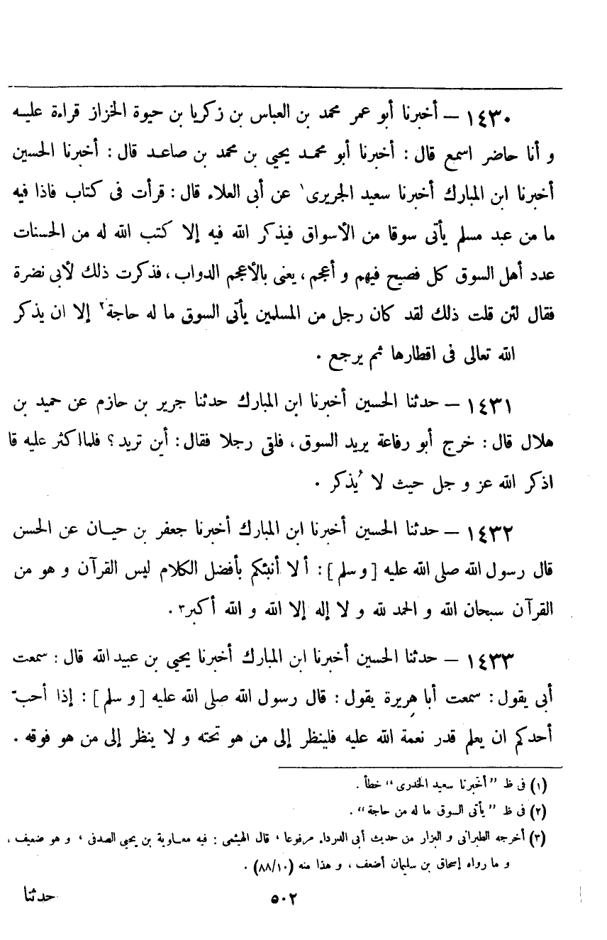 ١٤٣٠ - أَخْبَرَنَا أَبُو عُمَرَ بْنُ الْعَبَّاسِ بْنِ زَكَرِيَّا بْنِ حَيَوَيْهِ الْخَزَّازُ قِرَاءَةً عَلَيْهِ وَأَنَا حَاضِرٌ أَسْمَعُ قَالَ: أَخْبَرَنَا أَبُو مُحَمَّدٍ يَحْيَى بْنُ مُحَمَّدِ بْنِ صَاعِدٍ قَالَ: أَخْبَرَنَا الْحُسَيْنُ، أَخْبَرَنَا ابْنُ الْمُبَارَكِ، أَخْبَرَنَا سَعِيدٌ الْجُرَيْرِيُّ، عَنْ أَبِي الْعَلَاءِ قَالَ: قَرَأْتُ فِي كِتَابٍ فَإِذَا فِيهِ: «مَا مِنْ عَبْدٍ مُسْلِمٍ يَأْتِي سُوقًا مِنَ الْأَسْوَاقِ فَيَذْكُرُ اللَّهَ، إِلَّا كَتَبَ اللَّهُ لَهُ مِنَ الْحَسَنَاتِ عَدَدَ أَهْلِ السُّوقِ كُلِّ فَصِيحٍ فِيهِمْ وَأَعْجَمٍ، يَعْنِي بِالْأَعْجَمِ الدَّوَابَّ» ، فَذَكَرْتُ ذَلِكَ لِأَبِي نَضْرَةَ، فَقَالَ: «لَئِنْ قُلْتَ ذَلِكَ , لَقَدْ كَانَ رَجُلٌ مِنَ الْمُسْلِمِينَ يَأْتِي السُّوقَ مَا لَهُ حَاجَةٌ إِلَّا أَنْ يَذْكُرَ اللَّهَ تَعَالَى فِي أَقْطَارِهَا ثُمَّ يَرْجِعَ»