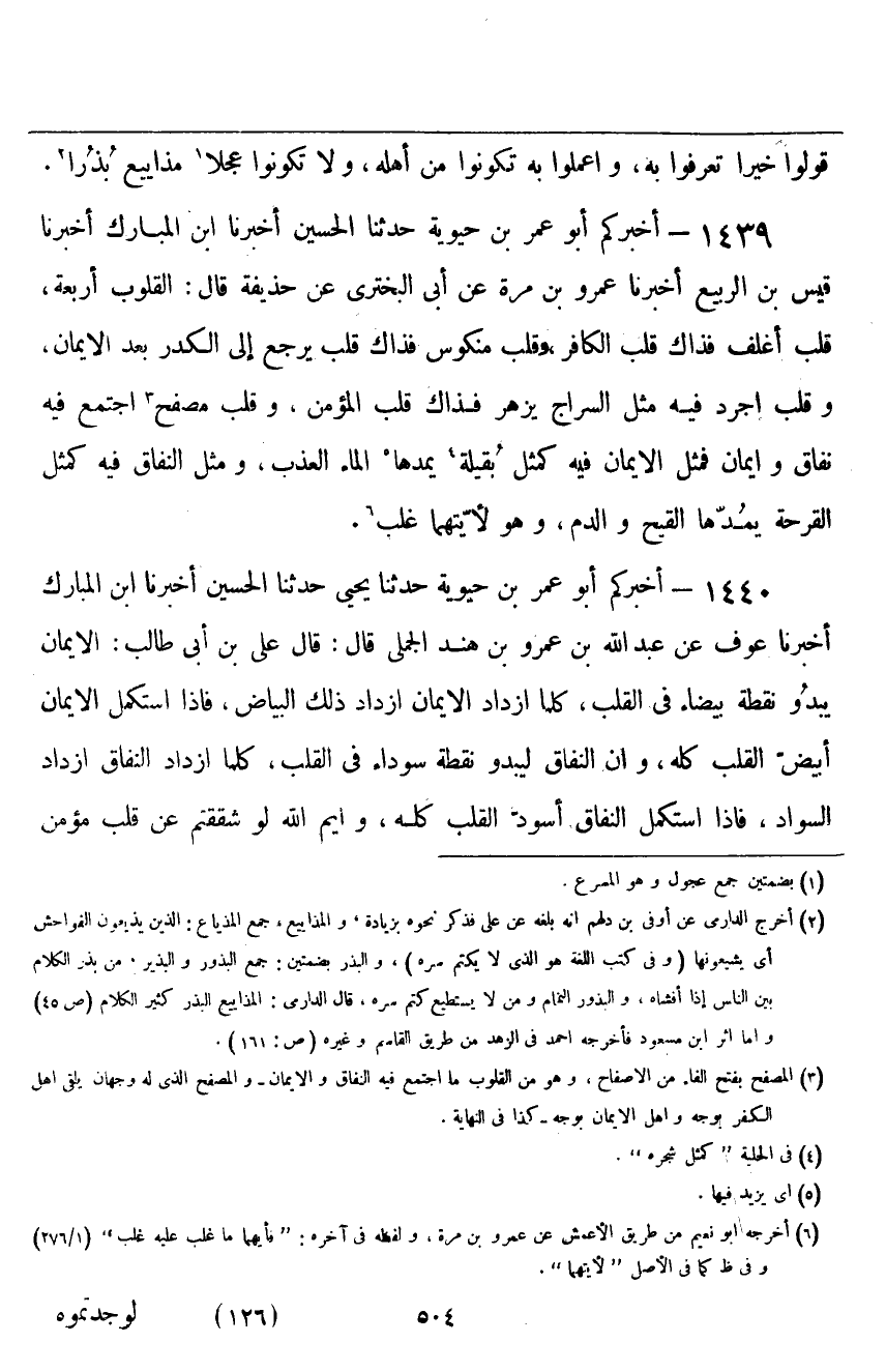 ١٤٣٩ - أَخْبَرَكُمْ أَبُو عُمَرَ بْنُ حَيَوَيْهِ، حَدَّثَنَا يَحْيَى، حَدَّثَنَا الْحُسَيْنُ، أَخْبَرَنَا ابْنُ الْمُبَارَكِ، أَخْبَرَنَا قَيْسُ بْنُ الرَّبِيعِ، أَخْبَرَنَا عَمْرُو بْنُ مُرَّةَ، عَنْ أَبِي الْبَخْتَرِيِّ، عَنْ حُذَيْفَةَ قَالَ: " الْقُلُوبُ أَرْبَعَةٌ: قَلْبٌ أَغْلَفُ فَذَاكَ قَلْبُ الْكَافِرِ، وَقَلَبٌ مَنْكُوسٌ فَذَاكَ قَلْبٌ يَرْجِعُ إِلَى الْكَدَرِ بَعْدَ الْإِيمَانِ، وَقَلْبٌ أَجْرَدُ فِيهِ مِثْلُ السِّرَاجِ يُزْهِرُ، فَذَاكَ قَلْبُ الْمُؤْمِنِ، وَقَلْبٌ مُصَفَّحٌ اجْتَمَعَ فِيهِ نِفَاقٌ وَإِيمَانٌ، فَمَثَلُ الْإِيمَانِ فِيهِ كَمَثَلِ بُقَيْلَةٍ يَمُدُّهَا الْمَاءُ الْعَذْبُ، وَمَثَلُ النِّفَاقِ فِيهِ كَمَثَلِ الْقُرْحَةِ يَمُدُّهَا الْقَيْحُ وَالدَّمُ، وَهُوَ لِأَيَّتِهِمَا غَلَبَ "