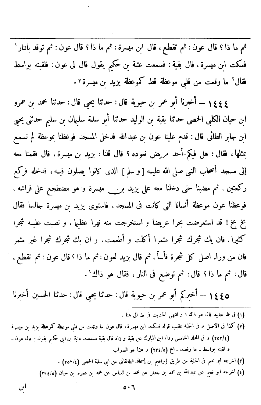 ١٤٤٤ - أَخْبَرَنَا أَبُو عُمَرَ بْنُ حَيَوَيْهِ، حَدَّثَنَا يَحْيَى قَالَ: حَدَّثَنَا مُحَمَّدُ بْنُ عَمْرِو بْنِ حَيَّانَ الْكَلْبِيُّ الْحِمْصِيُّ، حَدَّثَنَا بَقِيَّةُ بْنُ الْوَلِيدِ، حَدَّثَنَا أَبُو سَلَمَةَ سُلَيْمَانُ بْنُ سُلَيْمٍ، حَدَّثَنِي يَحْيَى بْنُ جَابِرٍ الطَّائِيُّ قَالَ: قَدِمَ عَلَيْنَا عَوْنُ بْنُ عَبْدِ اللَّهِ فَدَخَلَ الْمَسْجِدَ، فَوَعَظَنَا بِمَوْعِظَةٍ لَمْ نَسْمَعْ بِمِثْلِهَا، فَقَالَ: «هَلْ فِيكُمْ أَحَدٌ مَرِيضٌ نَعُودُهُ؟» قَالَ: قُلْنَا: يَزِيدُ بْنُ مَيْسَرَةَ، قَالَ: فَقُمْنَا مَعَهُ إِلَى مَسْجِدِ أَصْحَابِ النَّبِيِّ صَلَّى اللهُ عَلَيْهِ وَسَلَّمَ الَّذِي كَانُوا يُصَلُّونَ فِيهِ، فَدَخَلَهُ فَرَكَعَ رَكْعَتَيْنِ، ثُمَّ مَضَيْنَا حَتَّى دَخَلْنَا مَعَهُ عَلَى يَزِيدَ بْنِ مَيْسَرَةَ، وَهُوَ مُضْطَجِعٌ عَلَى فِرَاشِهِ، فَوَعَظَنَا عَوْنٌ مَوْعِظَةً أَنْسَانَا الَّتِي كَانَتْ فِي الْمَسْجِدِ، فَاسْتَوَى يَزِيدُ بْنُ مَيْسَرَةَ جَالِسًا، فَقَالَ: «بَخٍ بَخٍ، قَدِ اسْتَعْرَضْتَ بَحْرًا عَرِيضًا، وَاسْتَخْرَجْتَ مِنْهُ نَهَرًا عَظِيمًا، وَنَصَبْتَ عَلَيْهِ شَجَرًا كَثِيرًا، فَإِنْ يَكُ شَجَرُكَ شَجَرًا مُثْمِرًا أَكَلْتَ وَأَطْعَمْتَ، وَإِنْ يَكُ شَجَرُكَ شَجَرًا غَيْرَ مُثْمِرٍ فَإِنَّ مِنْ وَرَاءِ أَصْلِ كُلِّ شَجَرَةٍ فَأْسًا» ثُمَّ قَالَ يَزِيدُ لِعَوْنٍ: ثُمَّ مَاذَا؟ قَالَ عَوْنٌ: «ثُمَّ تُقْطَعُ» قَالَ: ثُمَّ مَاذَا؟ قَالَ: «ثُمَّ تُوضَعُ فِي النَّارِ» فَقَالَ: هُوَ ذَاكَ