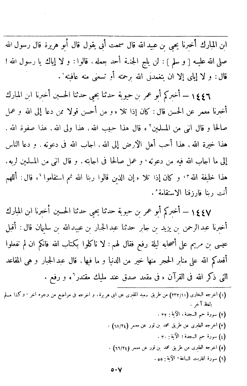 ١٤٤٦ - أَخْبَرَكُمْ أَبُو عُمَرَ بْنُ حَيَوَيْهِ، حَدَّثَنَا يَحْيَى، حَدَّثَنَا الْحُسَيْنُ، أَخْبَرَنَا ابْنُ الْمُبَارَكِ، أَخْبَرَنَا مَعْمَرٌ، عَنِ الْحَسَنِ قَالَ: كَانَ إِذَا تَلَا {وَمَنْ أَحْسَنُ قَوْلًا مِمَّنْ دَعَا إِلَى اللَّهِ وَعَمِلَ صَالِحًا وَقَالَ إِنَّنِي مِنَ الْمُسْلِمِينَ} [فصلت: ٣٣] قَالَ: " هَذَا حَبِيبُ اللَّهِ، هَذَا وَلِيُّ اللَّهِ، هَذَا صَفْوَةُ اللَّهِ، هَذَا خِيرَةُ اللَّهِ، هَذَا أَحَبُّ أَهْلِ الْأَرْضِ إِلَى اللَّهِ، أَجَابَ اللَّهَ فِي دَعْوَتِهِ، وَدَعَا النَّاسَ إِلَى مَا أَجَابَ اللَّهَ فِيهِ مِنْ دَعْوَتِهِ، وَعَمِلَ صَالِحًا فِي إِجَابَتِهِ، وَقَالَ: إِنَّنِي مِنَ الْمُسْلِمِينَ لِرَبِّهِ، هَذَا خَلِيفَةُ اللَّهِ "، وَكَانَ إِذَا تَلَا {إِنَّ الَّذِينَ قَالُوا رَبُّنَا اللَّهُ ثُمَّ اسْتَقَامُوا} [فصلت: ٣٠] قَالَ: «اللَّهُمَّ أَنْتَ رَبُّنَا فَارْزُقْنَا الِاسْتِقَامَةَ»