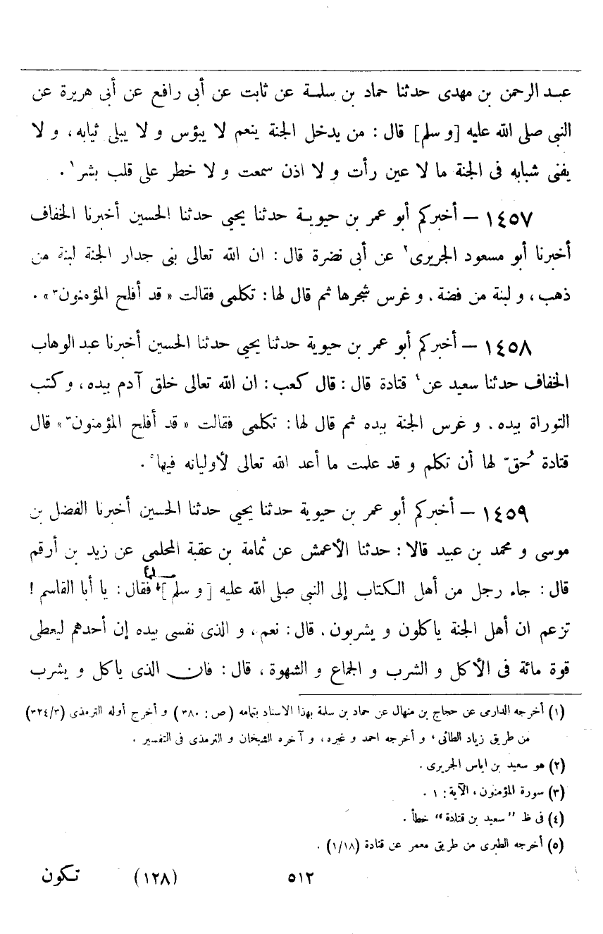 ١٤٥٨ - أَخْبَرَكُمْ أَبُو عُمَرَ بْنُ حَيَوَيْهِ، حَدَّثَنَا يَحْيَى، حَدَّثَنَا الْحُسَيْنُ، أَخْبَرَنَا عَبْدُ الْوَهَّابِ الْخَفَّافُ، حَدَّثَنَا سَعِيدٌ، عَنْ قَتَادَةَ قَالَ: قَالَ كَعْبٌ: " إِنَّ اللَّهَ تَعَالَى خَلَقَ آدَمَ بِيَدِهِ، وَكَتَبَ التَّوْرَاةَ بِيَدِهِ، وَغَرَسَ الْجَنَّةَ بِيَدِهِ ثُمَّ قَالَ لَهَا: تَكَلَّمِي فَقَالَتْ: قَدْ {أَفْلَحَ الْمُؤْمِنُونَ} [المؤمنون: ١] " قَالَ قَتَادَةُ: «حُقَّ لَهَا أَنْ تَكَلَّمَ وَقَدْ عَلِمَتْ مَا أَعَدَّ اللَّهُ تَعَالَى لِأَوْلِيَائِهِ فِيهَا»