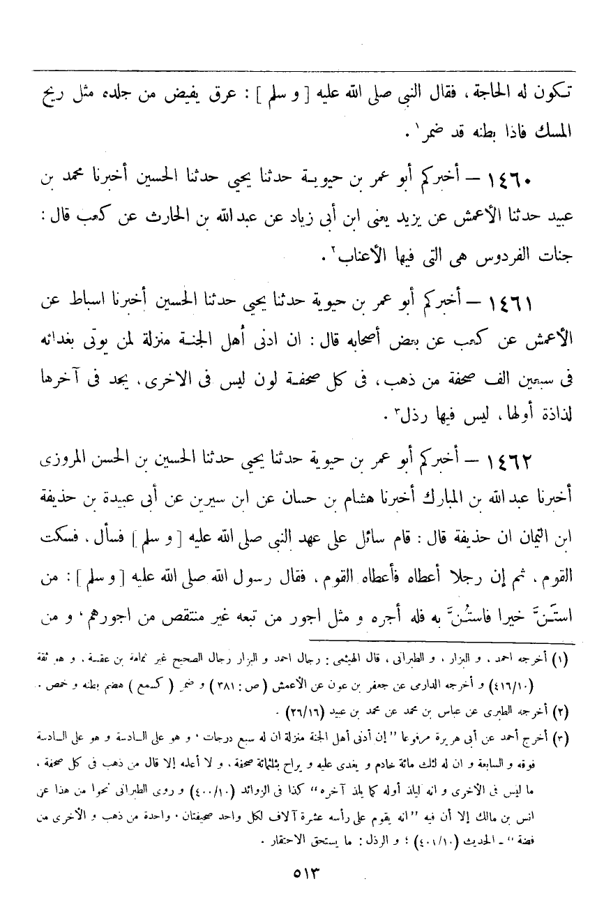١٤٦١ - أَخْبَرَكُمْ أَبُو عُمَرَ بْنُ حَيَوَيْهِ، حَدَّثَنَا يَحْيَى، حَدَّثَنَا الْحُسَيْنُ، أَخْبَرَنَا مُحَمَّدُ بْنُ عُبَيْدٍ، حَدَّثَنَا الْأَعْمَشُ، عَنْ يَزِيدَ، يَعْنِي ابْنَ أَبِي زِيَادٍ، عَنْ عَبْدِ اللَّهِ بْنِ الْحَارِثِ، عَنْ كَعْبٍ قَالَ: " جَنَّاتُ الْفِرْدَوْسِ: هِيَ الَّتِي فِيهَا الْأَعْنَابُ "