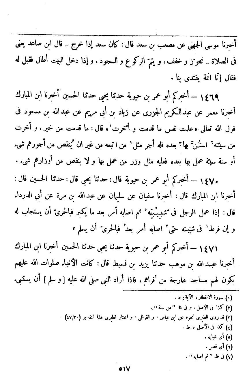 ١٤٦٩ - أَخْبَرَكُمْ أَبُو عُمَرَ بْنُ حَيَوَيْهِ، حَدَّثَنَا يَحْيَى، حَدَّثَنَا الْحُسَيْنُ، أَخْبَرَنَا ابْنُ الْمُبَارَكِ، أَخْبَرَنَا مَعْمَرٌ، عَنْ عَبْدِ الْكَرِيمِ الْجَزَرِيِّ، عَنْ زِيَادِ بْنِ أَبِي مَرْيَمَ، عَنْ عَبْدِ اللَّهِ بْنِ مَسْعُودٍ فِي قَوْلِ اللَّهِ تَعَالَى {عَلِمَتْ نَفْسٌ مَا قَدَّمَتْ وَأَخَّرَتْ} [الانفطار: ٥] قَالَ: «مَا قَدَّمَتْ مِنْ خَيْرٍ، وَأَخَّرَتْ مِنْ سَيِّئَةٍ اسْتُنَّ بِهَا بَعْدَهُ، فَلَهُ أَجْرٌ مِثْلِ مَنِ اتَّبَعَهُ مِنْ غَيْرِ أَنْ يُنْقَصَ مِنْ أُجُورِهِمْ شَيْءٌ، أَوْ سُنَّةٍ سَيِّئَةٍ عُمِلَ بِهَا بَعْدَهُ، فَعَلَيْهِ مِثْلُ وِزْرِ مَنْ عَمِلَ بِهَا وَلَا يُنْقِصُ مِنْ أَوْزَارِهِمْ شَيْءٌ»