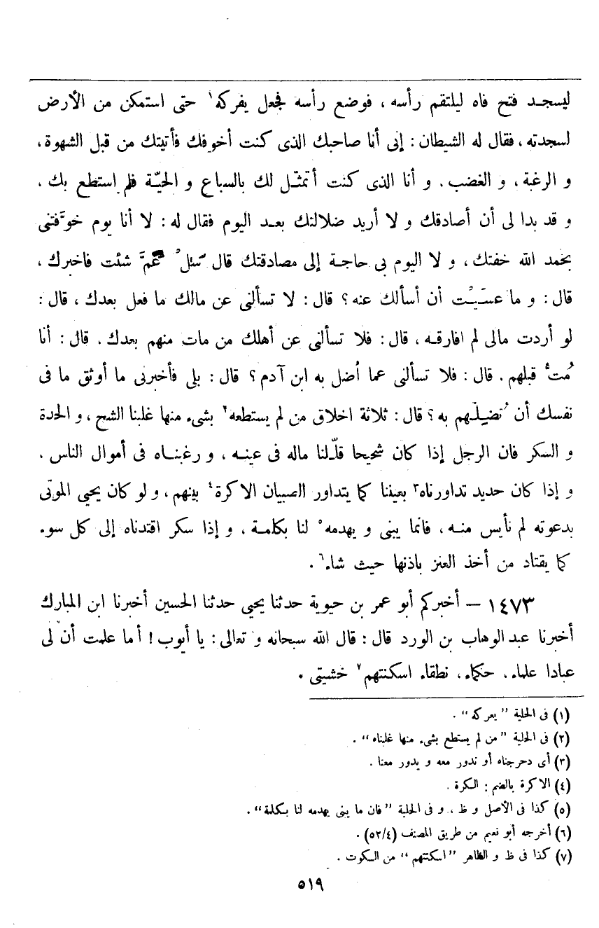 ١٤٧٣ - أَخْبَرَكُمْ أَبُو عُمَرَ بْنُ حَيَوَيْهِ، حَدَّثَنَا يَحْيَى، حَدَّثَنَا الْحُسَيْنُ، أَخْبَرَنَا ابْنُ الْمُبَارَكِ، أَخْبَرَنَا عَبْدُ الْوَهَّابِ بْنُ الْوَرْدِ قَالَ: قَالَ اللَّهُ سُبْحَانَهُ وَتَعَالَى: «يَا أَيُّوبُ أَمَا عَلِمْتَ أَنَّ لِي عِبَادًا عُلَمَاءَ حُكَمَاءَ نُطَقَاءَ أَسْكَنَتْهُمْ خَشْيَتِي»