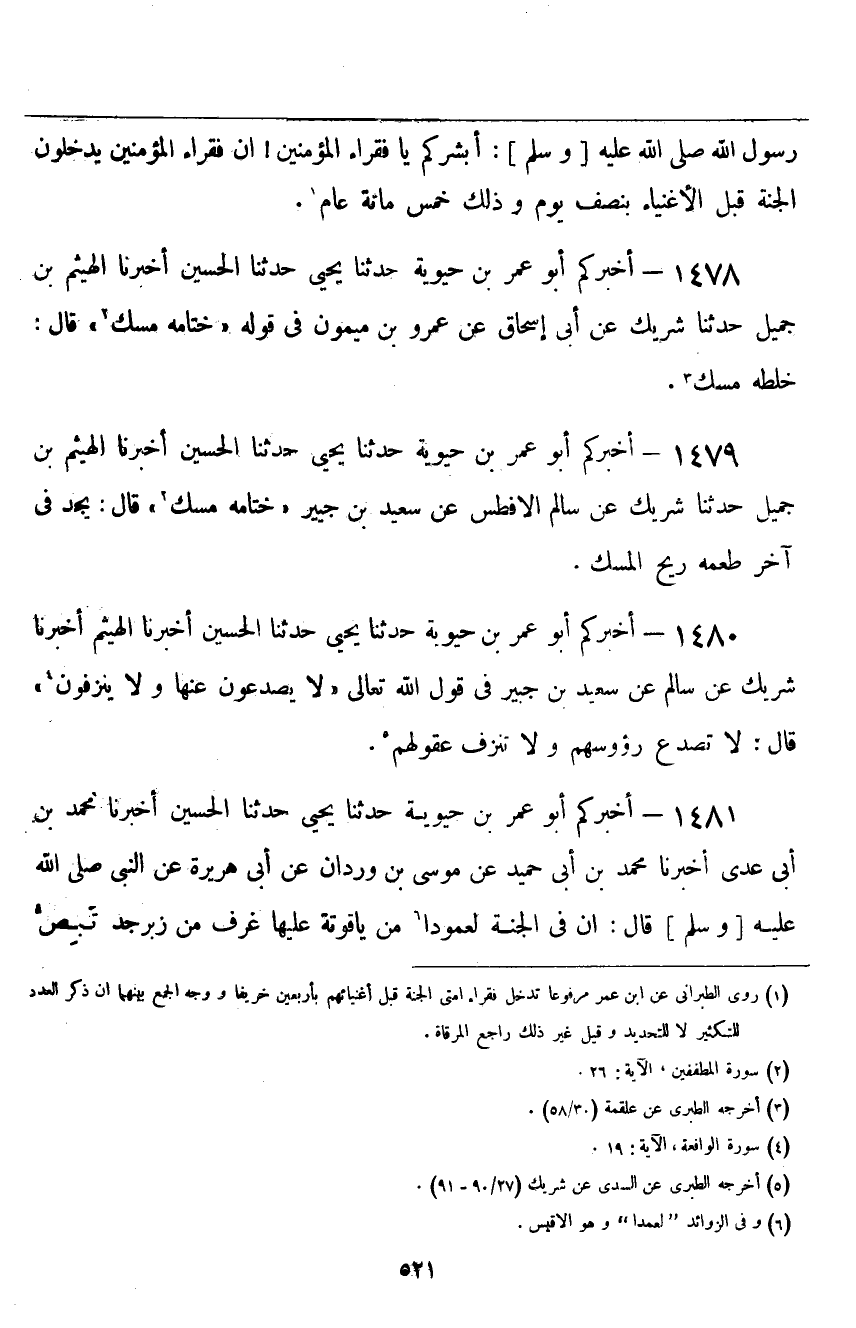 ١٤٨٠ - أَخْبَرَكُمْ أَبُو عُمَرَ بْنُ حَيَوَيْهِ، حَدَّثَنَا يَحْيَى، حَدَّثَنَا الْحُسَيْنُ، أَخْبَرَنَا الْهَيْثَمُ، أَخْبَرَنَا شَرِيكٌ، عَنْ سَالِمٍ، عَنْ سَعِيدِ بْنِ جُبَيْرٍ، فِي قَوْلِ اللَّهِ تَعَالَى: {لَا يُصَدَّعُونَ عَنْهَا وَلَا يُنْزِفُونَ} [الواقعة: ١٩] قَالَ: «لَا تُصَدَّعُ رُءُوسُهُمْ , وَلَا تُنْزَفُ عُقُولُهُمْ»