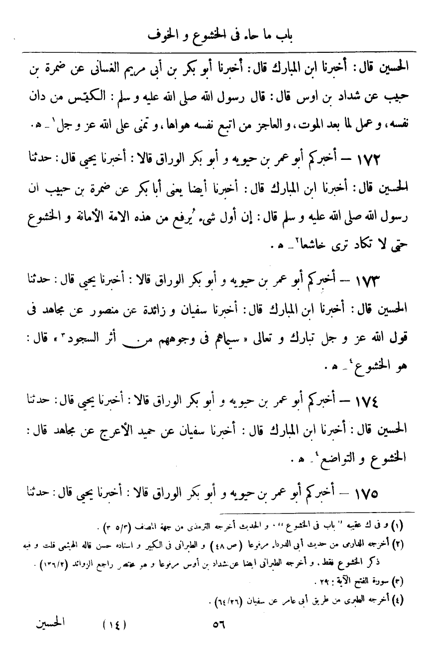 ١٧٢ - أَخْبَرَكُمْ أَبُو عُمَرَ بْنُ حَيَوَيْهِ، وَأَبُو بَكْرٍ الْوَرَّاقُ قَالَا: أَخْبَرَنَا يَحْيَى قَالَ: حَدَّثَنَا الْحُسَيْنُ قَالَ: أَخْبَرَنَا ابْنُ الْمُبَارَكِ قَالَ: أَخْبَرَنَا أَيْضًا يَعْنِي أَبَا بَكْرٍ، عَنْ ضَمْرَةَ بْنِ حَبِيبٍ، أَنَّ رَسُولَ اللَّهِ صَلَّى اللهُ عَلَيْهِ وَسَلَّمَ قَالَ: «إِنَّ أَوَّلَ شَيْءٍ يُرْفَعُ مِنْ هَذِهِ الْأُمَّةِ الْأَمَانَةُ وَالْخُشُوعُ، حَتَّى لَا تَكَادَ تَرَى خَاشِعًا»
