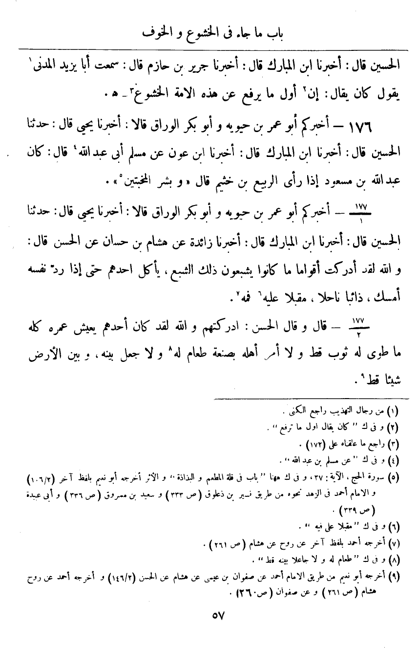 ١٧٦ - أَخْبَرَكُمْ أَبُو عُمَرَ بْنُ حَيَوَيْهِ، وَأَبُو بَكْرٍ الْوَرَّاقُ قَالَا: أَخْبَرَنَا يَحْيَى قَالَ: حَدَّثَنَا الْحُسَيْنُ قَالَ: أَخْبَرَنَا ابْنُ الْمُبَارَكِ قَالَ: أَخْبَرَنَا ابْنُ عَوْنٍ، عَنْ مُسْلِمٍ أَبِي عَبْدِ اللَّهِ، قَالَ كَانَ عَبْدُ اللَّهِ بْنُ مَسْعُودٍ إِذَا رَأَى الرَّبِيعَ بْنَ خُثَيْمٍ قَالَ: «وَبَشِّرِ الْمُخْبِتِينَ»