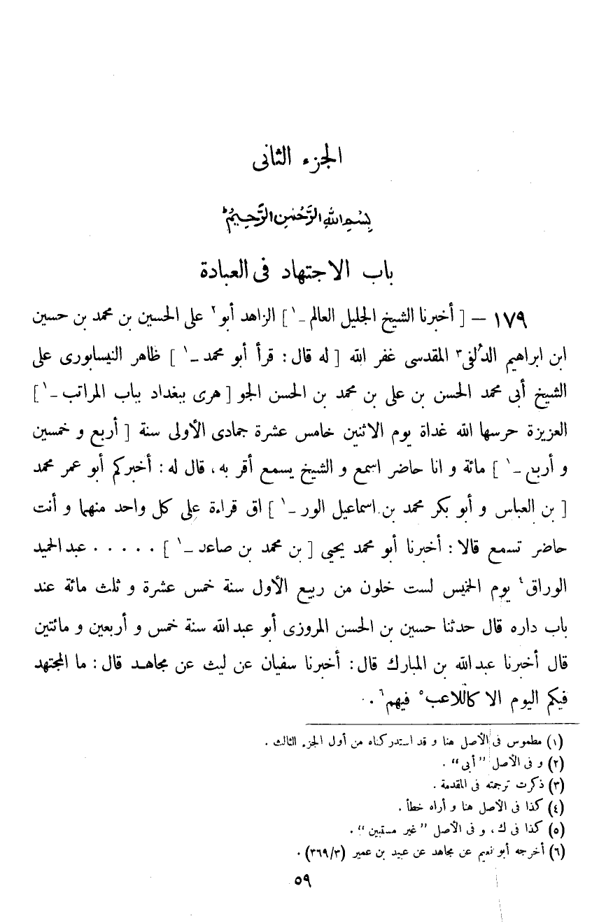 ١٧٩ - أَخْبَرَنَا الشَّيْخُ الْجَلِيلُ الْعَالِمُ الزَّاهِدُ أَبُو عَلِيٍّ الْحُسَيْنُ بْنُ مُحَمَّدِ بْنِ الْحُسَيْنِ بْنِ إِبْرَاهِيمَ الدُّلَفِيُّ الْمَقْدِسِيُّ غَفَرَ اللَّهُ لَهُ، قَالَ: قَرَأَ أَبُو مُحَمَّدٍ ظَاهِرٌ النَّيْسَابُورِيُّ، عَلَى الشَّيْخِ أَبِي مُحَمَّدٍ الْحَسَنِ بْنِ عَلِيِّ بْنِ مُحَمَّدِ بْنِ الْحَسَنِ الْجَوْهَرِيِّ بِبَغْدَادَ بِبَابِ الْمَرَاتِبِ الْعَزِيزَةِ حَرَسَهَا اللَّهُ غَدَاةَ يَوْمِ الْإِثْنَيْنِ خَامِسَ عَشْرَةَ جُمَادَى الْأُولَى سَنَةَ أَرْبَعٍ وَخَمْسِينَ وَأَرْبَعِمِائَةٍ وَأَنَا حَاضِرٌ أَسْمَعُ وَالشَّيْخُ يَسْمَعُ، أَقَرَّ بِهِ: قَالَ لَهُ: أَخْبَرَكُمْ أَبُو عُمَرَ مُحَمَّدُ بْنُ الْعَبَّاسِ، وَأَبُو بَكْرٍ مُحَمَّدُ بْنُ إِسْمَاعِيلَ الْوَرَّاقُ قِرَاءَةً عَلَى كُلِّ وَاحِدٍ مِنْهُمَا وَأَنْتَ حَاضِرٌ تَسْمَعُ قَالَا: أَخْبَرَنَا أَبُو مُحَمَّدٍ يَحْيَى بْنُ مُحَمَّدِ بْنِ صَاعِدٍ. . . عَبْدُ الْحَمِيدِ الْوَرَّاقُ يَوْمَ الْخَمِيسِ لِسِتٍّ خَلَوْنَ مِنْ رَبِيعٍ الْأَوَّلِ سَنَةَ خَمْسَ عَشَرَةَ وَثَلَاثِمِائَةٍ عِنْدَ بَابِ دَارِاهِ، قَالَ: حَدَّثَنَا الْحُسَيْنُ بْنُ الْحَسَنِ الْمَرْوَزِيُّ أَبُو عَبْدِ اللَّهِ سَنَةَ خَمْسٍ وَأَرْبَعِينَ وَمِائَتَيْنِ، قَالَ: أَخْبَرَنَا عَبْدُ اللَّهِ بْنُ الْمُبَارَكِ، قَالَ: أَخْبَرَنَا سُفْيَانُ، عَنْ لَيْثٍ، عَنْ مُجَاهِدٍ قَالَ: «مَا الْمُجْتَهِدُ فِيكُمُ الْيَوْمَ إِلَّا كَاللَّاعِبِ فِيهِمْ»